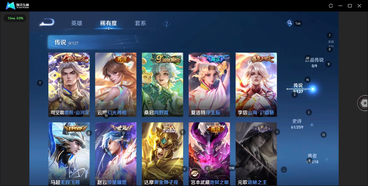 - PX_2104880-Q/至尊星耀/197皮肤/125英雄/1典藏/0珍品无双/0无双/0珍品传说/20传说/53史诗/9稀有英雄 【1 典藏皮肤】九霄神辉 花木兰, 【20 传说皮肤】启明星使 虞姬,逐花归海 澜,无双飞将 马超,白虎志 百里玄策,地狱火 孙悟空,云鹰飞将 曜,永曜之星 杨戬,凤求凰 李白,落雪白狼 亚连,时雨天司 诸葛亮,炽阳神光 镜,曦玄引 吕布,霜月吟 露娜,怒海麟威 吕布