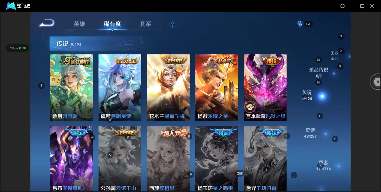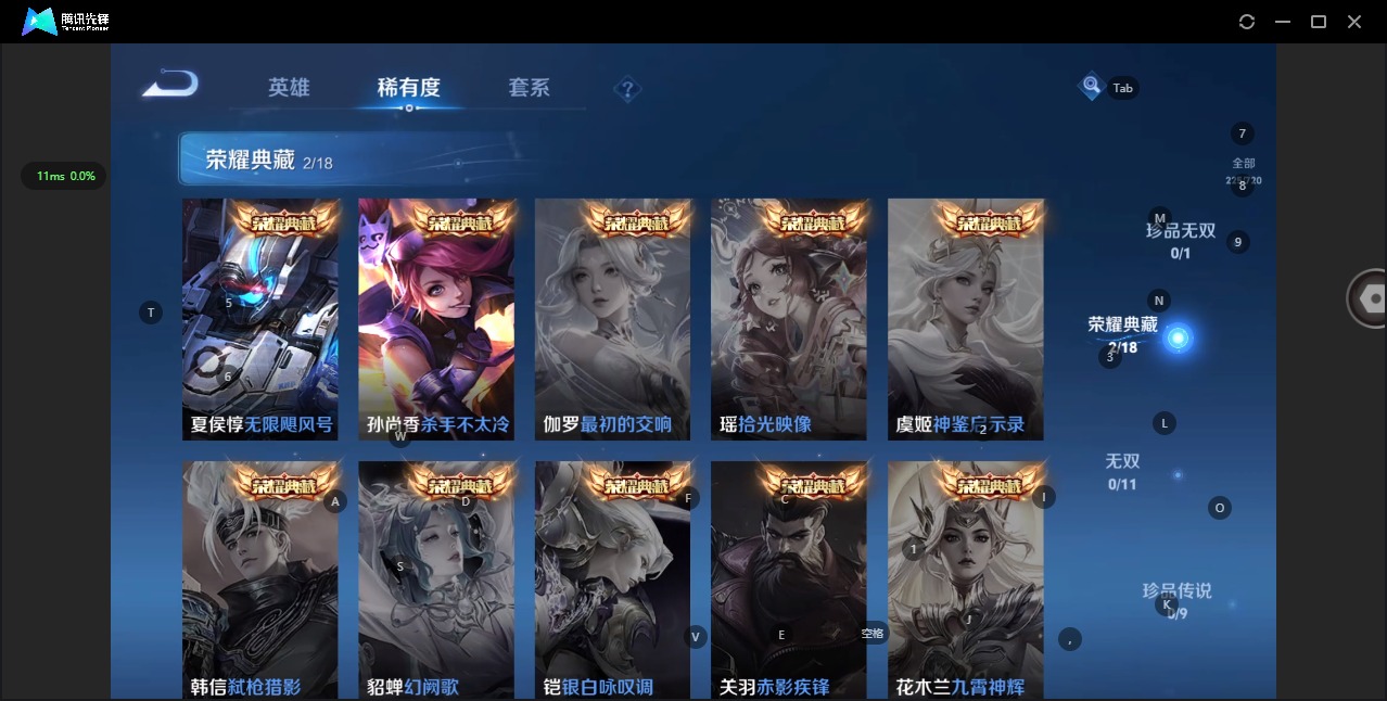 - PX_2090692-68 安卓QQ/至尊星耀/341皮肤/125英雄/2典藏/0珍品无双/0无双/1珍品传说/18传说/104史诗/9稀有英雄 【1 珍品传说】怪盗基德 马可波罗, 【2 典藏皮肤】全息碎影 孙悟空,赤影疾锋 关羽, 【18 传说皮肤】枫霜尽 橘右京,启明星使 虞姬,逐花归海 澜,云鹰飞将 曜,地狱之眼 宫本武藏,音你心动 周瑜,炽阳神光 镜,乞巧织情 王昭君,时之恋人 刘备,久