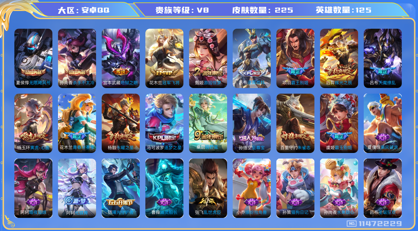 - [12232578]V8 1典藏 2珍品传说 23传说 125英雄 252皮肤 可修改实名 优质装备:银白咏叹调(倪克斯侍卫),器灵·落星盏,朽木白哉,黄金射手座,冠军飞将,炽阳神光,末日机甲-孙尚香(绿蚂蚱),地狱火,地狱之眼,时之恋人-刘备(电焊工),超时空战士-狄仁杰,无双飞将,山海·炽霜斩(李信年限),山海·苍雷引(电光曜子),鹤归松栖(云缨),澜逐花归海,琥珀纪元铠,涂山容容 传说皮:乘龙·铭钟鼎(赵云年限),铠冥王哈迪斯,幻光神枪 珍宝阁皮:万物之道,玩趣恶龙 限定皮:鸣野蒿,傲雪梅枪,时雨天司(水龙头),神威(电光马子),遇见飞天,高山流水,诗剑行,五谷丰年,天狼狩猎者,逐梦之星,天狼征服者,玄武志(苏烈年限),永曜之星,孙行者,猪悟能,寅虎·赤拳(老虎年限) 史诗皮:赞萌露比,器灵·浮梦炉,星界战将,龙之律动,石田雨龙,茶境仙,破空之剑,东方月初,埋骨钱,芈月浮光幕影,百相守梦-百里守约,百相守梦-黄忠,紫霞仙子,苍穹之光,白龙吟,黄金分割率,特工魅影,千年之狐,江河有灵,鹤归松栖(赵怀真),魅语,蒙恬荣光圣徽,晚萤,电玩·爆裂旋风,银翎春语,龙骑士(小龙虾),末日机甲-吕布,猫狗日记-孙策,乱世虎臣,节奏热浪,修罗,摇滚巨星,水果甜心,星夜王子,心灵骇客,功夫厨神,德古拉伯爵,暗隐猎兽者,幽灵船长,鬼剑武藏,暗渊魔法,缤纷独角兽,乘风破浪,逐浪之夏,水晶猎龙者,曙光守护者,热力回旋,金属风暴,原初追逐者,圣诞狂欢,圣诞恋歌,鹰眼统帅,魅力维加斯,黎明之约,赏金猎手,顽趣-阿古朵,无心,未来纪元-赵云
