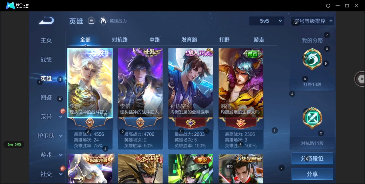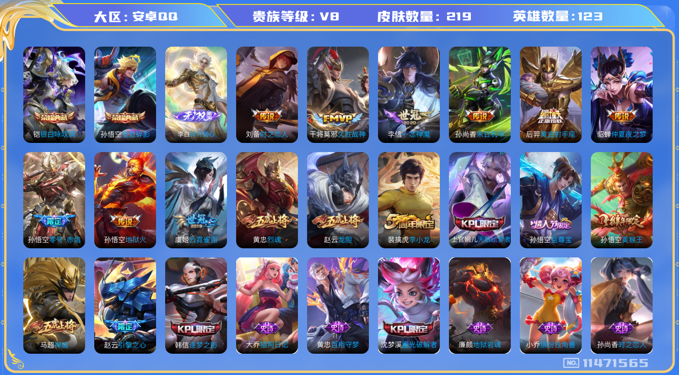 [11471565]V8 2典藏 1无双 10传说 123英雄 219皮肤 可修改实名 荣耀水晶:银白咏叹调(倪克斯侍卫),全息碎影(猴子典藏) 无双皮:碎月剑心(李白无双) 传说皮:黄金射手座,零号·赤焰,地狱火,仲夏夜之梦(大飞蛾),末日机甲-孙尚香(绿蚂蚱),云霓雀翎,一念神魔,久胜战神,时之恋人-刘备(电焊工) 珍宝阁皮:优雅恋人,蔷薇恋人,女武神 限定皮:至尊宝,神威(电光马子),龙胆,烈魂,天狼绘梦者,李小龙,逐梦之影,引擎之心,美猴王 史诗皮:百相守梦-黄忠,黄金分割率,特工魅影,千年之狐,完美假期,江河有灵,百解令(蒙犽),匿光破解者,偶像歌手,晚萤,魅语,末日机甲-吕布,猫狗日记-孙策,猫狗日记-大乔,时之恋人-孙尚香,修罗,摇滚巨星,水果甜心,天才门将,星夜王子,暗隐猎兽者,心灵战警,舞动绿茵,地狱岩魂,纤云弄巧,繁星吟游(呼啦呼啦),拒霜思,缤纷独角兽,逐浪之夏,水晶猎龙者,热力回旋,金属风暴,鹰眼统帅,魅力维加斯,未来纪元-赵云