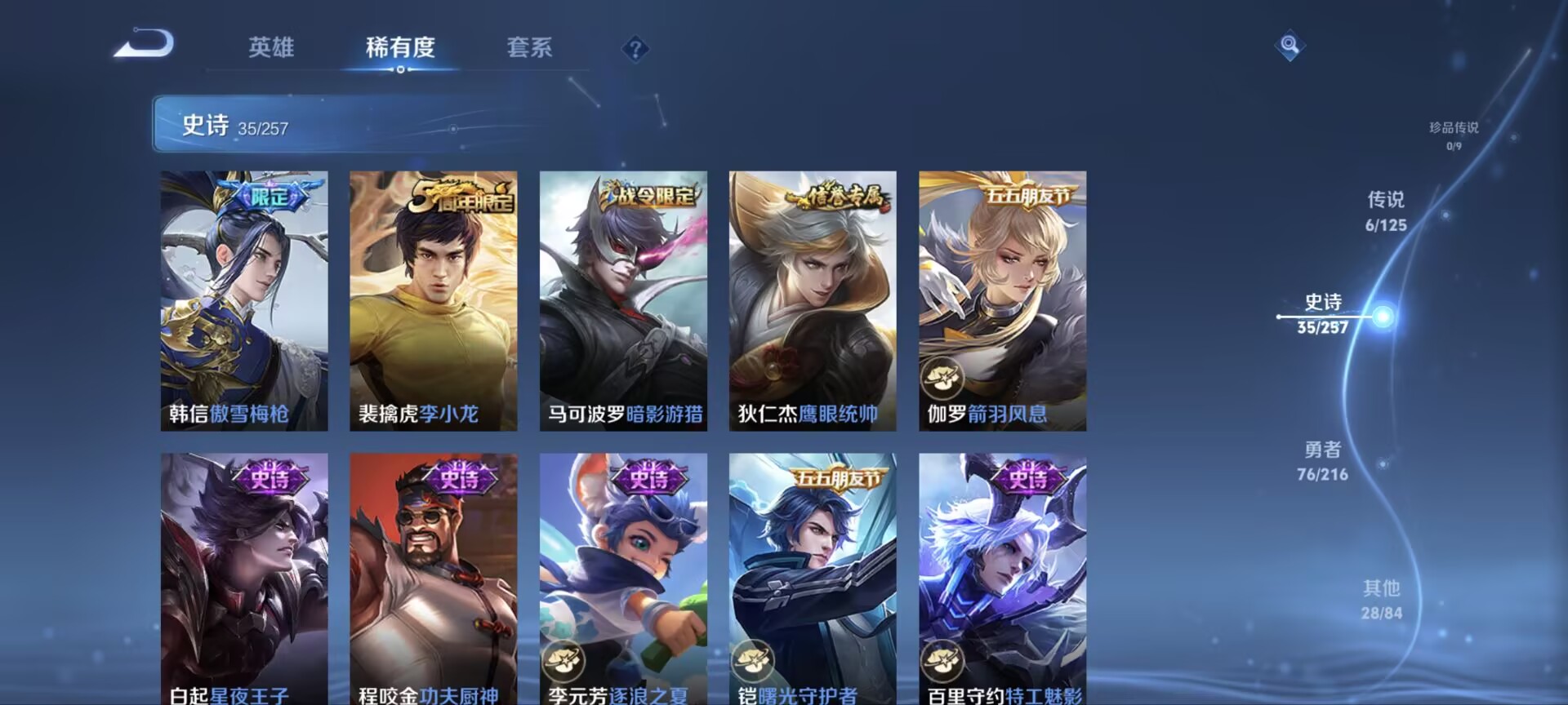- PX_2085006-贵族等级: V2 英雄数: 88 皮肤数: 48 传说皮: 山海·琳琅生 限定皮: 五谷丰年