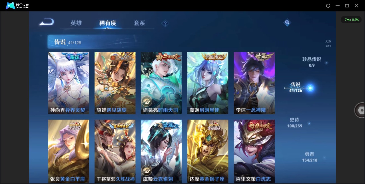 - PX_2085906-贵族等级: V7 英雄数: 121 皮肤数: 172 传说皮: 黄金狮子座,黄金射手座,一念神魔,零号·赤焰,幻光神枪 限定皮: 李小龙,御风骁将,烈魂,天狼溯光者,神威,蜜橘之夏,天狼绘梦者,至尊宝,如梦令-后羿,五谷丰年,鸣野蒿