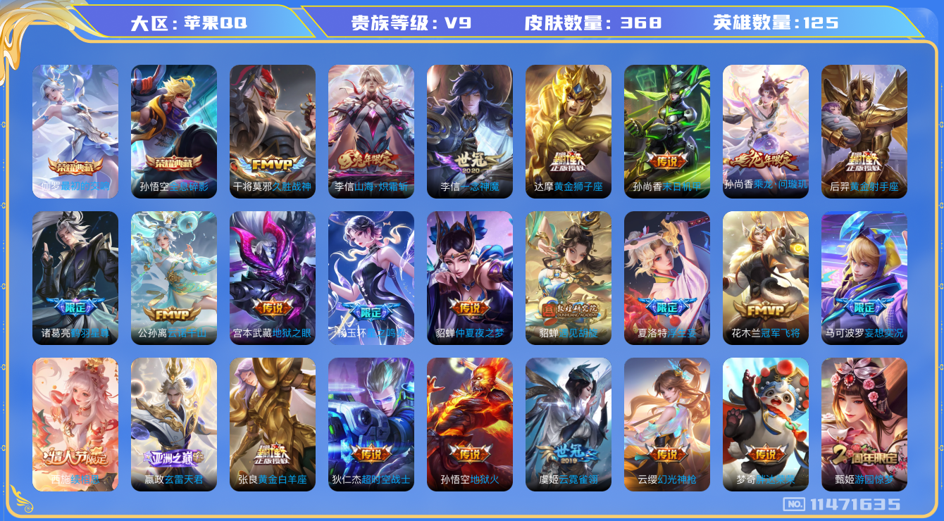 [11471635]V9 2典藏 41传说 125英雄 368皮肤 可修改实名 优质装备:全息碎影(猴子典藏),最初的交响(伽罗典藏),黄金狮子座,黄金射手座,冠军飞将,黄金白羊座,久胜战神,一念神魔,云霓雀翎,末日机甲-孙尚香(绿蚂蚱),地狱火,仲夏夜之梦(大飞蛾),地狱之眼,胖达荣荣,超时空战士-狄仁杰,遇见胡旋,山海·炽霜斩(李信年限),浮生妄,鹤羽星尊,妄想实况,玄雷天君 传说皮:乘龙·问璇玑(孙尚香年限),云诺千山,续相思,星之鸣奏,幻光神枪 珍宝阁皮:万物之道,蔷薇恋人,女武神,玩趣恶龙 限定皮:愿照·九州拓(澜年限),愿照·福禄聚(蔡文姬年限),愿照·岁时盈(虞姬年限),愿照·山河定(司空震年限),愿照·众生和(妲己年限),愿照·千秋盛(女娲年限),鸣野蒿,至尊宝,白虎志(电光耗子),凤求凰(白切鸡),异界灵契(白毛香),傲雪梅枪,绯月行,时雨天司(水龙头),瑞麟志(木兰年限),遇见飞天,高山流水,诗剑行,五谷丰年,冰锋战神,游园惊梦,梁祝,逐梦之音,李小龙,逐梦之影,朱雀志(守约年限),永曜之星,辉光之辰,霸王别姬-虞姬,引擎之心,天魔缭乱,青春决赛季,冰霜恋舞曲,美猴王,枫霜尽,山海·玄木吟(马可年限) 史诗皮:狼魂孤将,瑰影绮梦,化蝶舞,星界战将,龙之律动,石田雨龙,茶境仙,谪仙醉月,百相守梦-黄忠,紫霞仙子,电玩小子(小书包),黄金分割率,特工魅影,千年之狐,永昼,电玩·爆裂旋风,真我赫兹(镜),江河有灵,蒙恬荣光圣徽,偶像歌手,龙骑士(小龙虾),魅语,无限星赏官,晚萤,冰冠公主,末日机甲-吕布,猫狗日记-孙策,猫狗日记-大乔,乱世虎臣,节奏热浪,修罗,女仆咖啡,水果甜心,绅士熊喵,天才门将,星夜王子,心灵骇客,德古拉伯爵,暗隐猎兽者,幽灵船长,鬼剑武藏,暗渊魔法,心灵战警,舞动绿茵,地狱岩魂,纤云弄巧,繁星吟游(呼啦呼啦),拒霜思,缤纷独角兽,乘风破浪,逐浪之夏,水晶猎龙者,箭羽风息,金属风暴,原初追逐者,圣诞狂欢,圣诞恋歌,鹰眼统帅,王者之锤,暗夜贵公子,魅力维加斯,黎明之约,赏金猎手,无心,未来纪元-赵云