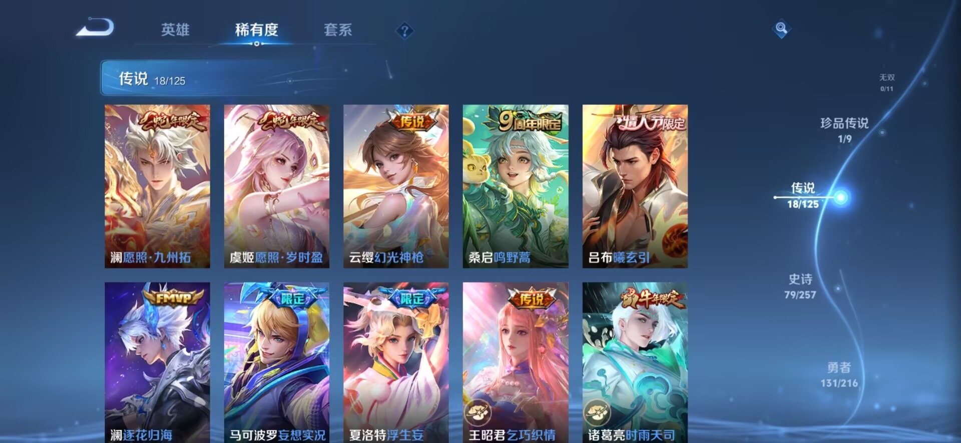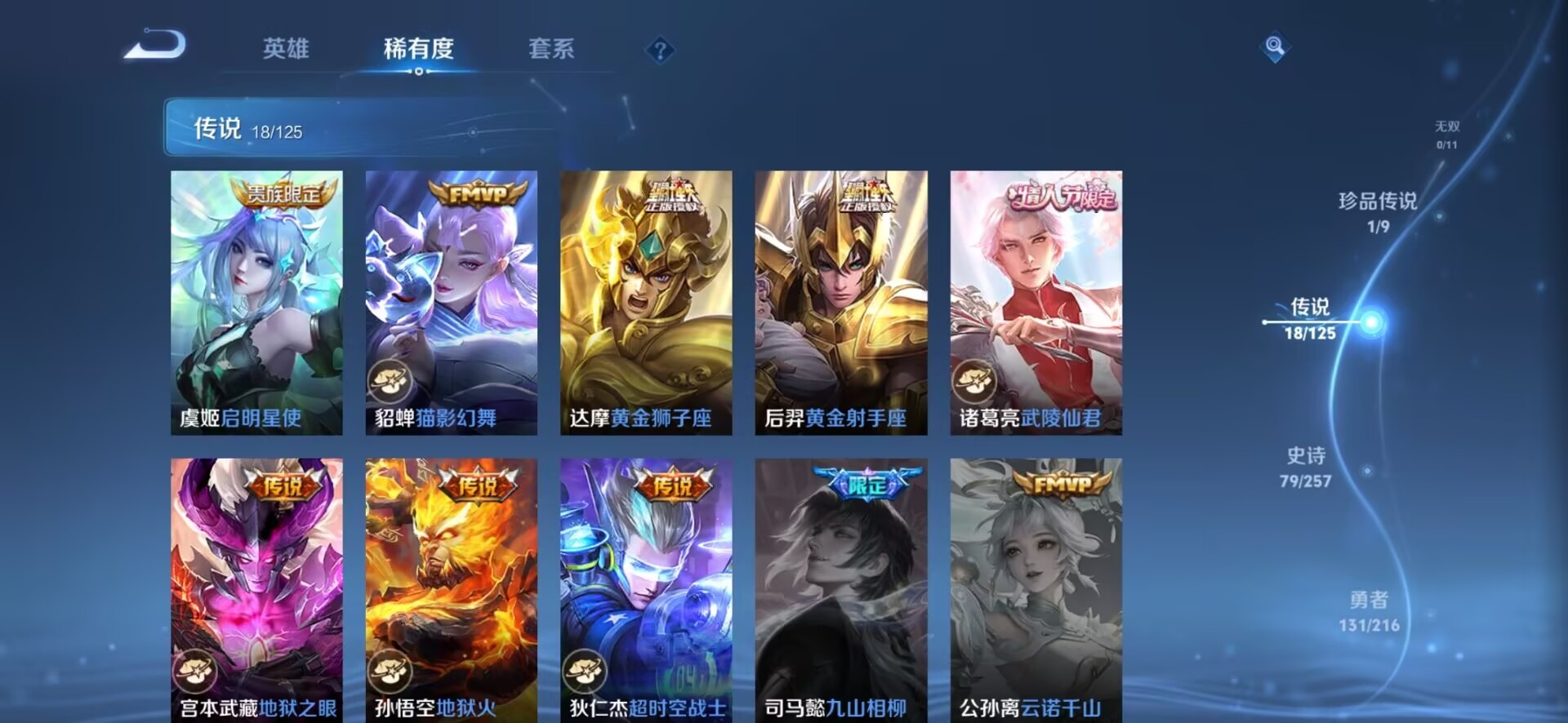 - [12231007]V7 1珍品传说 14传说 124英雄 165皮肤 可修改实名 优质装备:大耳狗之梦,黄金射手座,云鹰飞将(小将军),猫影幻舞,末日机甲-孙尚香(绿蚂蚱),地狱火,仲夏夜之梦(大飞蛾),零号·赤焰,李逍遥,淬星耀世,超时空战士-狄仁杰 传说皮:云诺千山,祥瑞亨通 限定皮:愿照·山河定(司空震年限),时雨天司(水龙头),遇见飞天,梁祝,李小龙,蜜橘之夏 史诗皮:鸭鸭历险记-刘禅,绮世丹青,化蝶舞,龙之律动,雪豹·霜爪,藏狐·褐绒,布丁狗之誓,石田雨龙,星界特工,紫霞仙子,黄金分割率,千年之狐,江河有灵,修罗,女仆咖啡,水果甜心,德古拉伯爵,暗隐猎兽者,纤云弄巧,繁星吟游(呼啦呼啦),缤纷独角兽,乘风破浪,曙光守护者,圣诞恋歌,鹰眼统帅,魅力维加斯