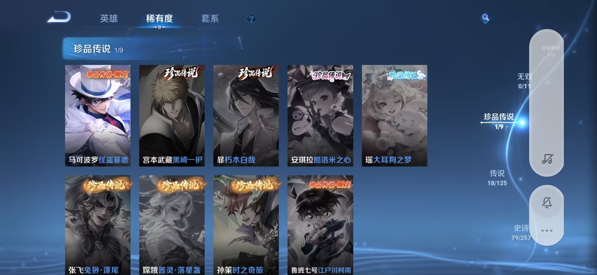 夏侯惇朔风刀,老夫子醍醐杖,沈梦溪大漠名商,苏烈千军破阵,达摩沙漠行僧,吕布猎兽之王,兰陵王金庭之子,裴擒虎擒涛扼浪,鲁班大师探海日志,明世隐疑决卦,鬼谷子原初探秘者,张良古海寻踪,桑启海盐诗旅,狄仁杰万华元夜,程咬金演武夺筹,李元芳云中旅人,米莱狄御霄,钟馗驱傩正仪,狂铁御狮