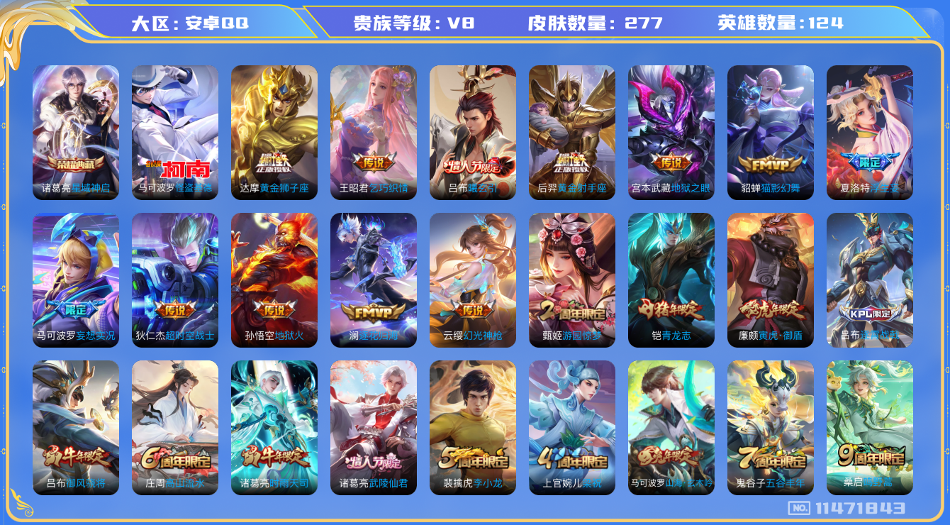 [11471843]V8 1典藏 1珍品传说 18传说 124英雄 277皮肤 可修改实名 荣耀水晶:星域神启(倪克斯贼亮) 珍品传说:怪盗基德 传说皮:吕布曦玄引,幻光神枪,黄金狮子座,黄金射手座,地狱火,地狱之眼,猫影幻舞,乞巧织情,超时空战士-狄仁杰,浮生妄,妄想实况,澜逐花归海 珍宝阁皮:蔷薇恋人,女武神 限定皮:愿照·九州拓(澜年限),愿照·岁时盈(虞姬年限),逐霄战戟,鸣野蒿,武陵仙君(小桃花),时雨天司(水龙头),神威(电光马子),高山流水,五谷丰年,青龙志(铠年限),冰锋战神,游园惊梦,梁祝,御风骁将(吕布年限),李小龙,大圣娶亲,引擎之心,寅虎·御盾(廉颇年限),山海·玄木吟(马可年限) 史诗皮:飞车小橘子,撼地雄心,鸭鸭历险记-刘禅,龙之律动,雪豹·霜爪,百相守梦-百里守约,百相守梦-黄忠,战舞者,决胜骁骑,百相守梦-周瑜,化蝶舞,破空之剑,紫霞仙子,电玩小子(小书包),白龙吟,黄金分割率,特工魅影,江河有灵,百解令(蒙犽),冰冠公主,青蛇,偶像歌手,魅语,龙骑士(小龙虾),末日机甲-吕布,猫狗日记-孙策,猫狗日记-大乔,乱世虎臣,节奏热浪,修罗,女仆咖啡,摇滚巨星,水果甜心,绅士熊喵,天才门将,星夜王子,心灵骇客,功夫厨神,德古拉伯爵,幽灵船长,鬼剑武藏,心灵战警,乐园奇幻夜,天秀·启明,舞动绿茵,地狱岩魂,纤云弄巧,拒霜思,乘风破浪,逐浪之夏,月团寄思,水晶猎龙者,金属风暴,圣诞狂欢,圣诞恋歌,鹰眼统帅,暗夜贵公子,魅力维加斯,赏金猎手,寅虎·御盾,未来纪元-赵云