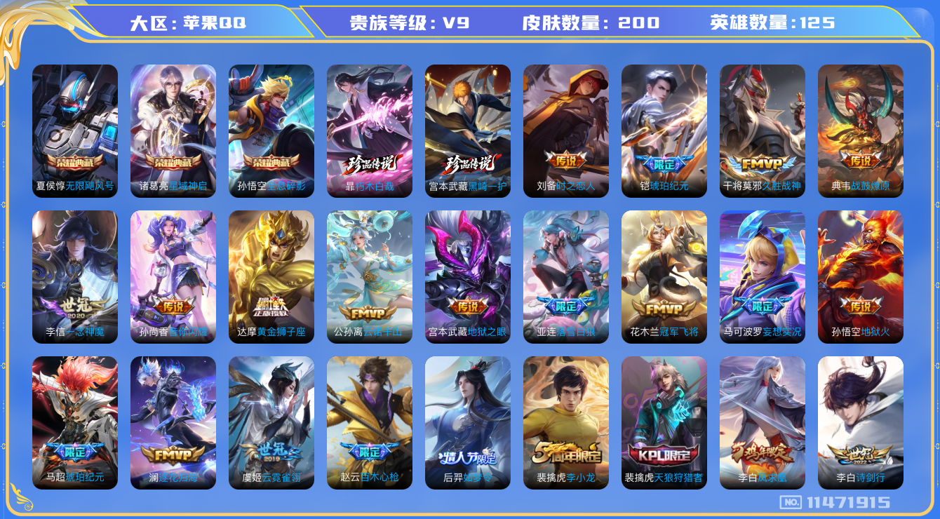 [11471915]V9 3典藏 2珍品传说 19传说 125英雄 200皮肤 可修改实名 优质装备:无限飓风号(高达),全息碎影(猴子典藏),星域神启(倪克斯贼亮),朽木白哉,黑崎一护,黄金狮子座,冠军飞将,久胜战神,一念神魔,云霓雀翎,地狱火,地狱之眼,时之恋人-刘备(电焊工),音你闪耀(rap皮),妄想实况,澜逐花归海,琥珀纪元铠,琥珀纪元马超 传说皮:典韦战鼓燎原,落雪白狼,云诺千山 珍宝阁皮:优雅恋人 限定皮:凤求凰(白切鸡),飞衡(韩信年限),诗剑行,天狼狩猎者,李小龙,如梦令-后羿,神奇女侠,百木心枪 史诗皮:赞萌露比,鸭鸭历险记-刘禅,绮世丹青,星界特工,龙之律动,百相守梦-周瑜,戍鼓铭心,琥珀纪元伽罗,守夜人,紫霞仙子,白龙吟,黄金分割率,特工魅影,千年之狐,永昼,高渐离燃音魔法,偶像歌手,龙骑士(小龙虾),晚萤,冰冠公主,青蛇,乱世虎臣,节奏热浪,修罗,摇滚巨星,水果甜心,心灵骇客,功夫厨神,德古拉伯爵,暗隐猎兽者,幽灵船长,地狱岩魂,曙光守护者,金属风暴,圣诞狂欢,鹰眼统帅,未来纪元-赵云