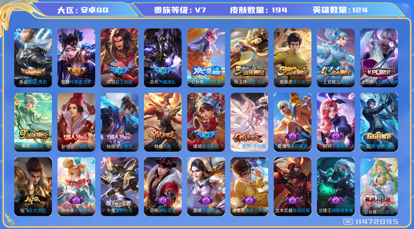 [11472095]V7 1典藏 4传说 124英雄 194皮肤 可修改实名 优质装备:鸣剑·曳影,仲夏夜之梦(大飞蛾),涂山容容 珍宝阁皮:蔷薇恋人 限定皮:愿照·岁时盈(虞姬年限),鸣野蒿,至尊宝,飞衡(韩信年限),遇见飞天,梁祝,天狼绘梦者,李小龙,霸王别姬-项羽,霸王别姬-虞姬,大圣娶亲,天魔缭乱,蜜橘之夏 史诗皮:星界战将,龙之律动,紫霞仙子,黄金分割率,特工魅影,千年之狐,偶像歌手,龙骑士(小龙虾),乱世虎臣,节奏热浪,修罗,水果甜心,星夜王子,功夫厨神,暗隐猎兽者,鬼剑武藏,纤云弄巧,繁星吟游(呼啦呼啦),乘风破浪,逐浪之夏,水晶猎龙者,曙光守护者,原初追逐者,圣诞狂欢,鹰眼统帅,魅力维加斯,黎明之约,未来纪元-赵云