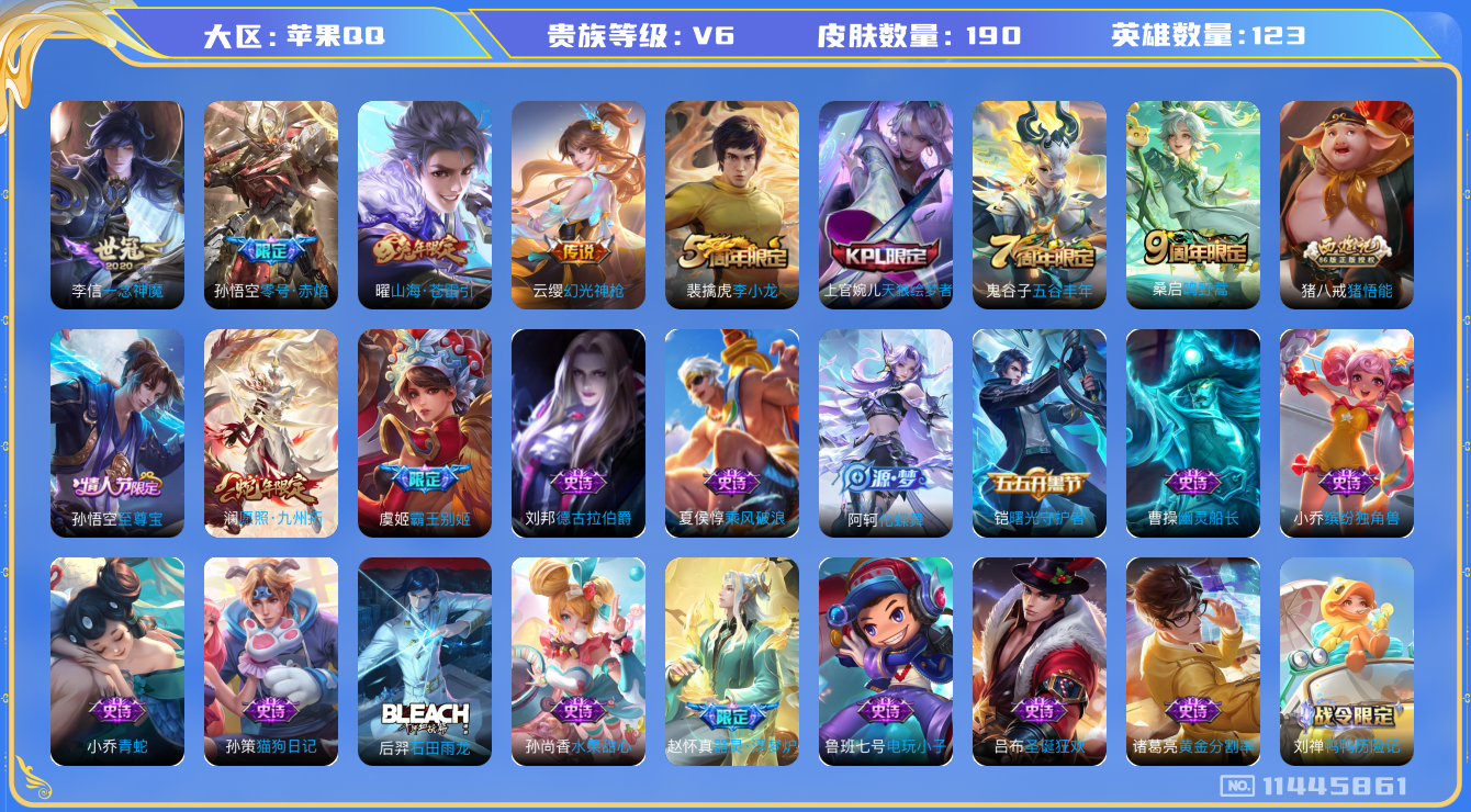[11445861]V6 6传说 123英雄 190皮肤 可修改实名 优质装备:一念神魔,零号·赤焰,山海·苍雷引(电光曜子) 传说皮:幻光神枪 珍宝阁皮:蔷薇恋人,玩趣恶龙 限定皮:愿照·九州拓(澜年限),鸣野蒿,至尊宝,五谷丰年,天狼绘梦者,李小龙,霸王别姬-虞姬,猪悟能 史诗皮:鸭鸭历险记-刘禅,器灵·浮梦炉,化蝶舞,龙之律动,石田雨龙,百相守梦-百里守约,电玩小子(小书包),白龙吟,黄金分割率,千年之狐,偶像歌手,冰冠公主,青蛇,猫狗日记-孙策,女仆咖啡,水果甜心,绅士熊喵,星夜王子,功夫厨神,德古拉伯爵,幽灵船长,鬼剑武藏,纤云弄巧,繁星吟游(呼啦呼啦),缤纷独角兽,乘风破浪,水晶猎龙者,曙光守护者,金属风暴,圣诞狂欢,圣诞恋歌,鹰眼统帅,魅力维加斯