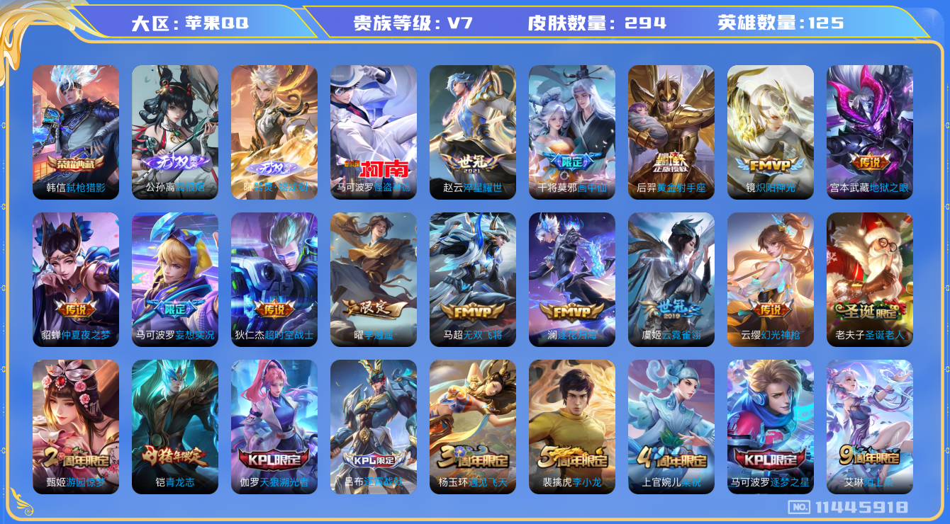 [11445918]V7 1典藏 2无双 1珍品传说 15传说 125英雄 294皮肤 可修改实名 优质装备:弑枪猎影(韩信典藏),离恨烟(公孙离无双),器灵·螭龙剑,怪盗基德,黄金射手座,炽阳神光,云霓雀翎,仲夏夜之梦(大飞蛾),地狱之眼,李逍遥,淬星耀世,超时空战士-狄仁杰,无双飞将,画中仙,妄想实况,澜逐花归海 传说皮:幻光神枪 珍宝阁皮:万物之道,蔷薇恋人 限定皮:愿照·九州拓(澜年限),逐霄战戟,陌上桑,鸣野蒿,至尊宝,傲雪梅枪,遇见飞天,五谷丰年,青龙志(铠年限),游园惊梦,梁祝,逐梦之星,天狼溯光者,李小龙,圣诞老人,孙行者,时之奇旅-妲己 史诗皮:器灵·浮梦炉,化蝶舞,龙之律动,百相守梦-周瑜,茶境仙,海诺心动手记,破空之剑,战舞者,东方月初,谪仙醉月,百相守梦-百里守约,百相守梦-黄忠,紫霞仙子,电玩小子(小书包),白龙吟,特工魅影,百相守梦(关羽),电玩·爆裂旋风,江河有灵,蒙恬荣光圣徽,偶像歌手,龙骑士(小龙虾),暗夜猫娘,魅语,青蛇,末日机甲-吕布,猫狗日记-孙策,乱世虎臣,节奏热浪,摇滚巨星,水果甜心,绅士熊喵,星夜王子,心灵骇客,功夫厨神,德古拉伯爵,暗隐猎兽者,幽灵船长,鬼剑武藏,暗渊魔法,心灵战警,乐园奇幻夜,舞动绿茵,地狱岩魂,诗语江南,缤纷独角兽,乘风破浪,逐浪之夏,月团寄思,水晶猎龙者,曙光守护者,金属风暴,原初追逐者,圣诞狂欢,圣诞恋歌,鹰眼统帅,魅力维加斯,黎明之约,赏金猎手,千筹问战,无心