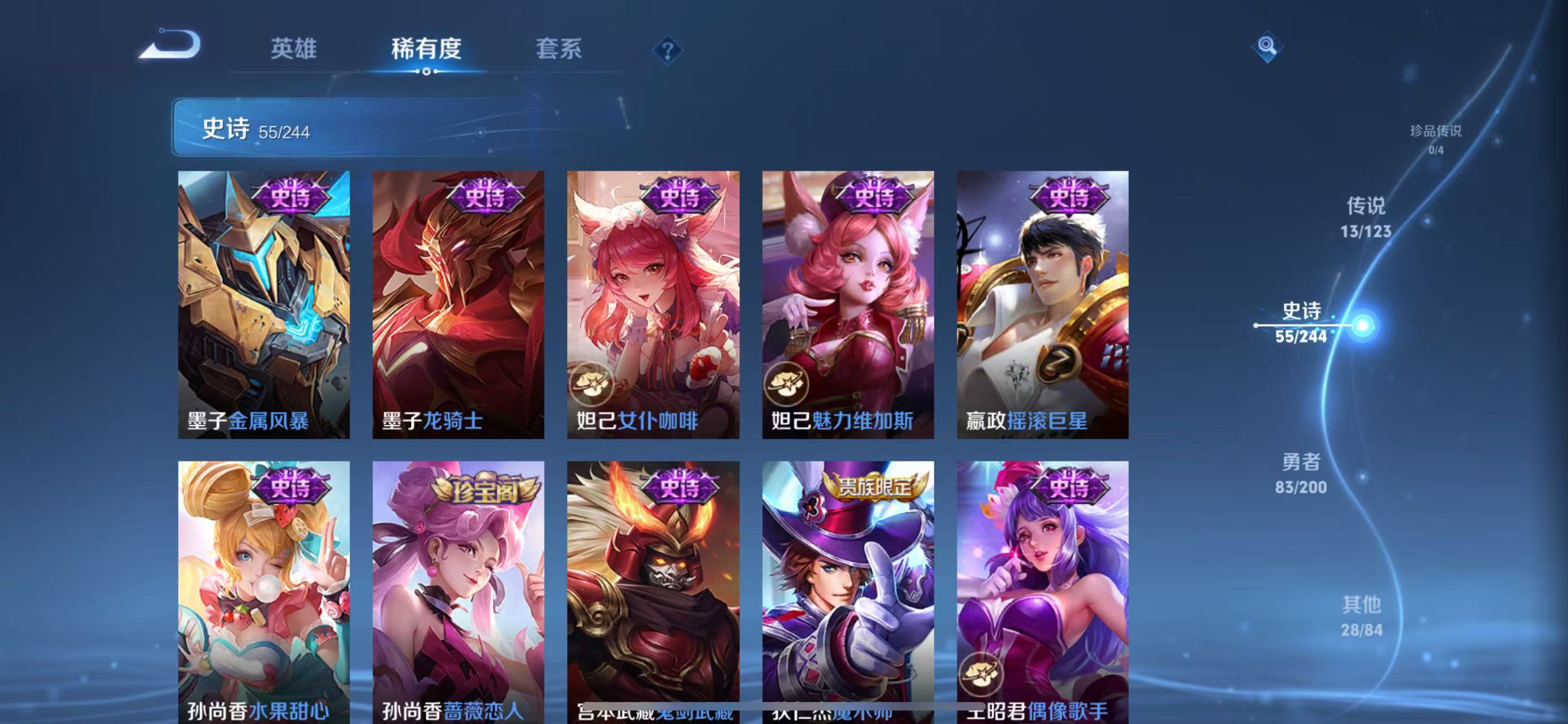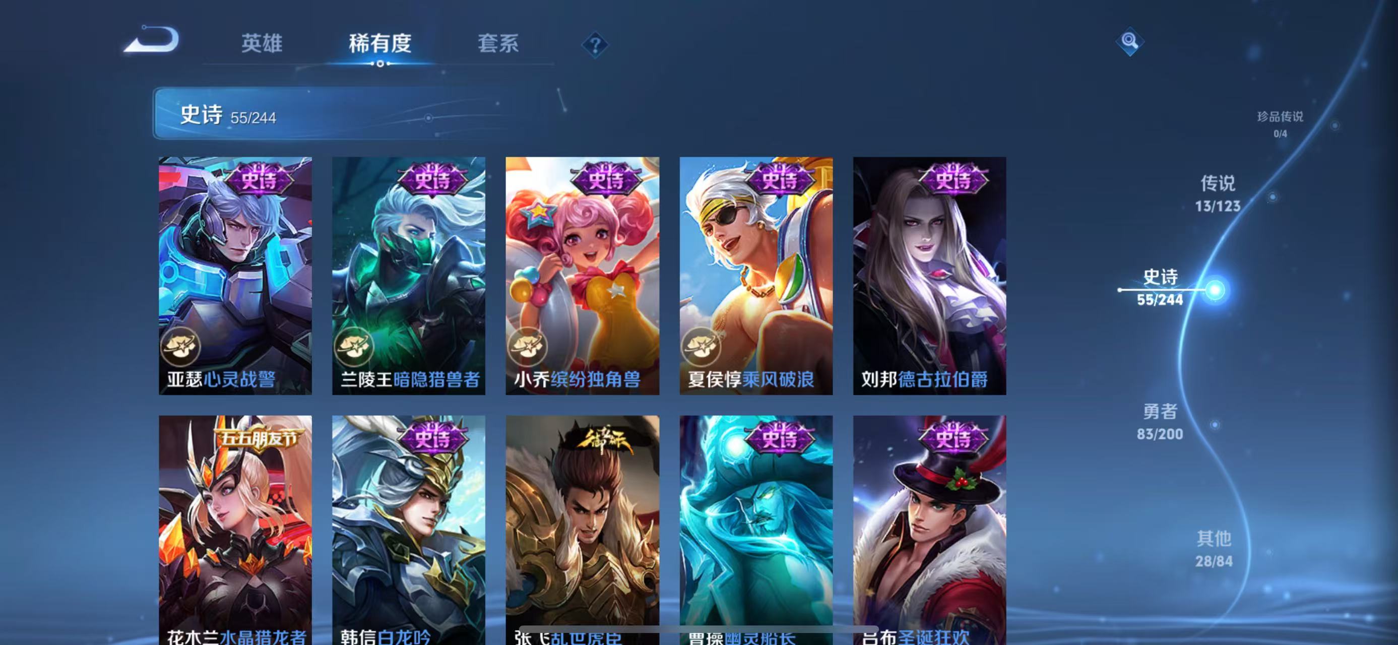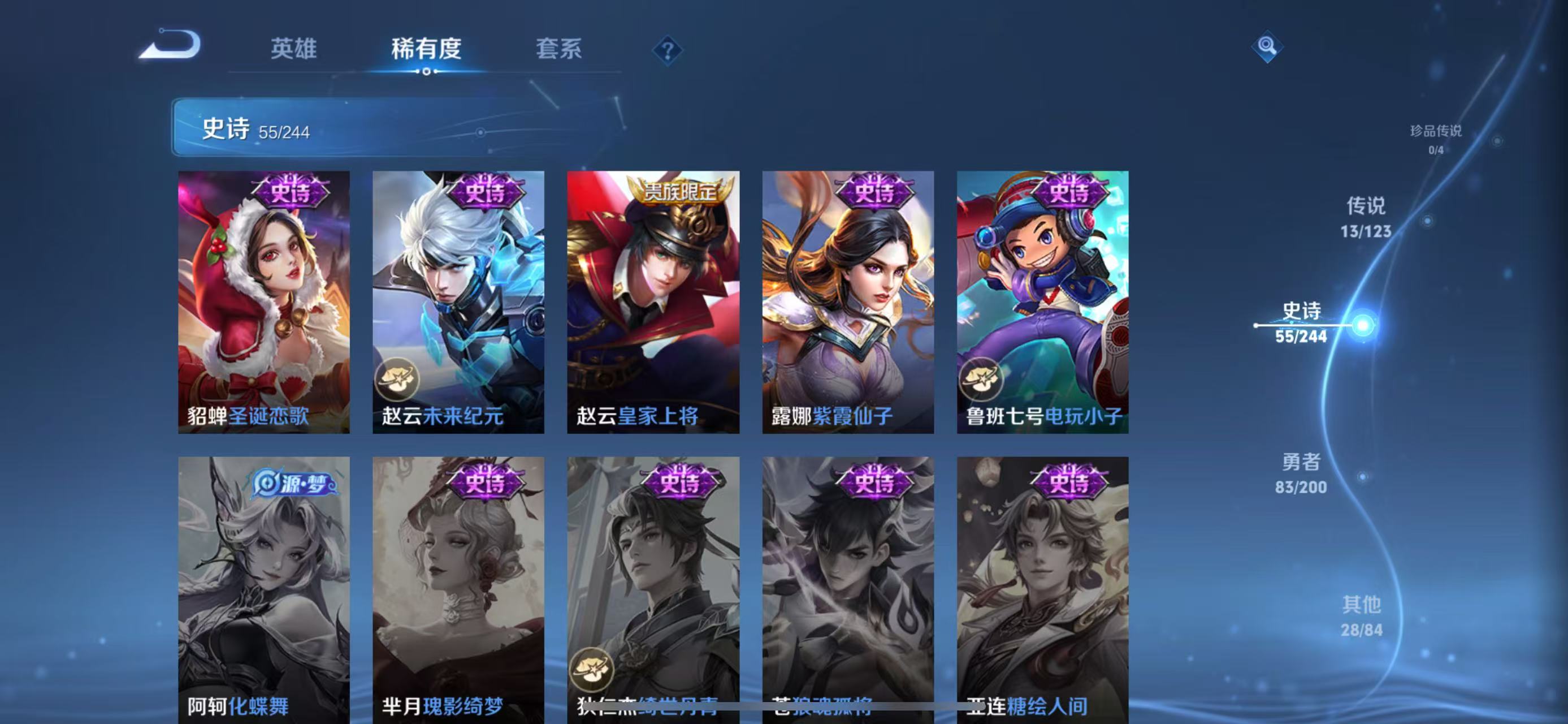 李元芳逐浪之夏,孙策猫狗日记,阿轲节奏热浪,露娜紫霞仙子,王昭君偶像歌手,韩信白龙吟,雅典娜冰冠公主,鲁班七号电玩小子,橘右京修罗,墨子龙骑士,嬴政摇滚巨星,刘禅天才门将,安琪拉心灵骇客,程咬金功夫厨神,刘邦德古拉伯爵,兰陵王暗隐猎兽者,曹操幽灵船长,宫本武藏鬼剑武藏,亚瑟心灵战警,西施诗语江南,小乔缤纷独角兽,夏侯惇乘风破浪,花木兰水晶猎龙者,铠曙光守护者,墨子金属风暴,吕布圣诞狂欢,貂蝉圣诞恋歌,百里守约特工魅影,嫦娥拒霜思,雅典娜黎明之约,夏洛特永昼,刘禅电玩·爆裂旋风,关羽决胜骁骑