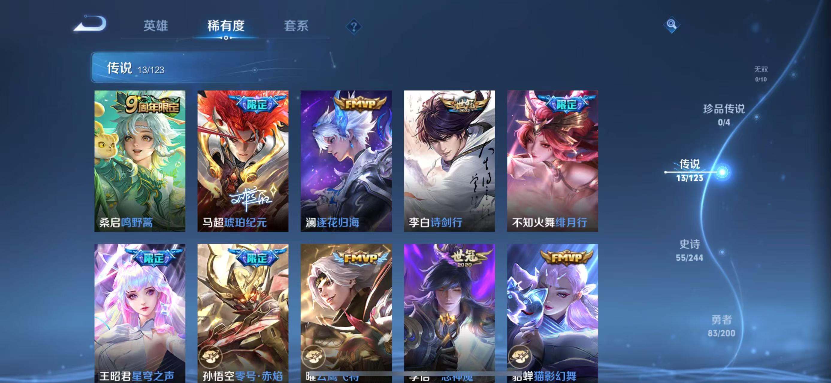 上官婉儿梁祝,马超神威,孙悟空孙行者,韩信傲雪梅枪,王昭君星穹之声,不知火舞绯月行,李白诗剑行,桑启鸣野蒿