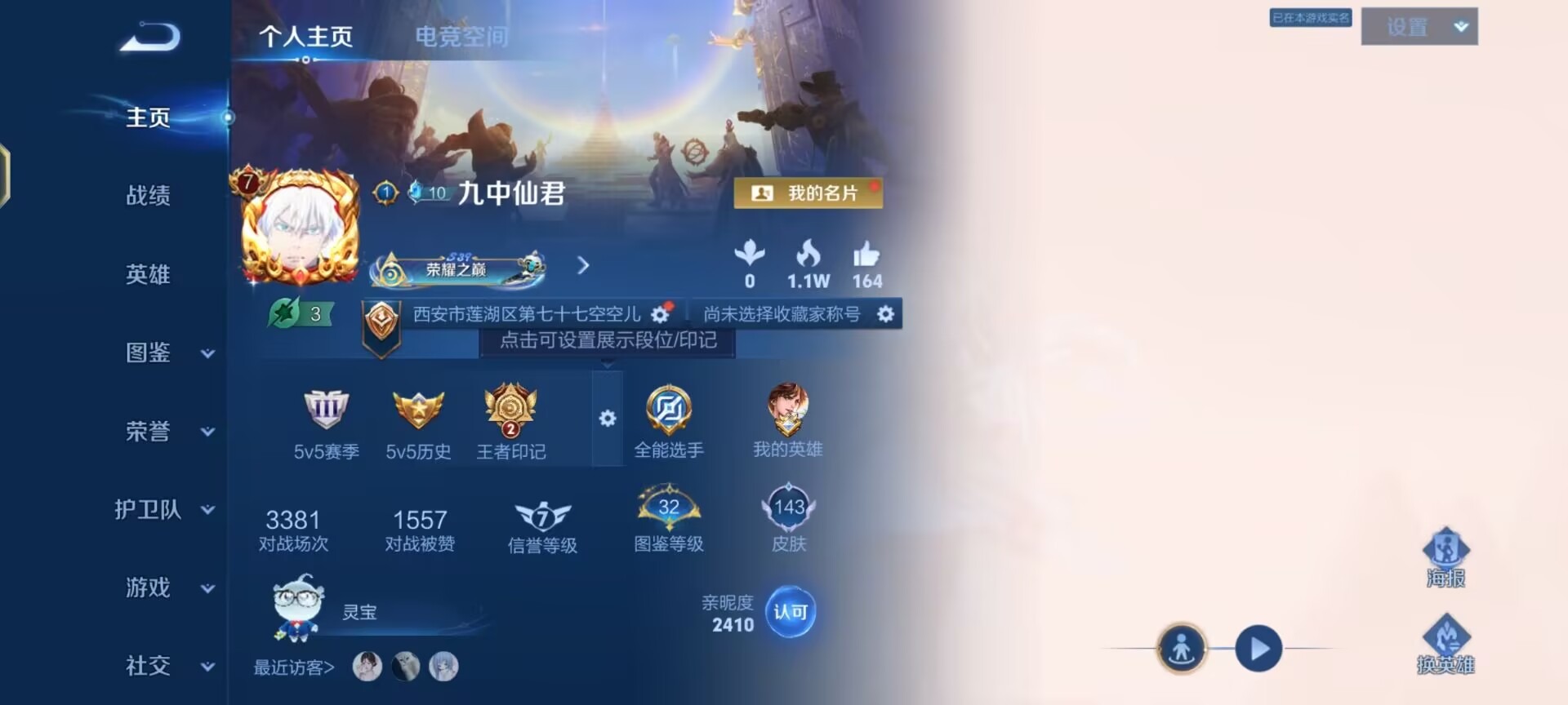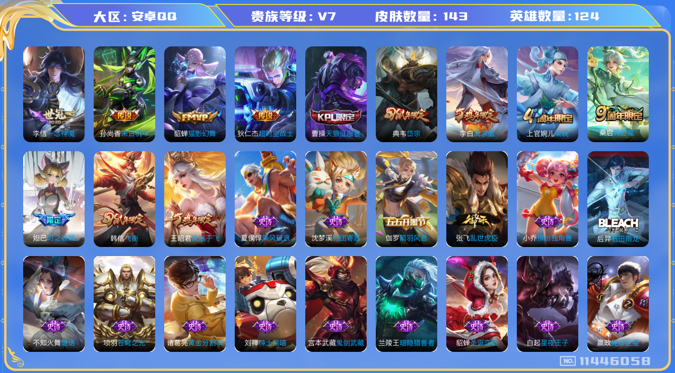 - [12084435]V7 1典藏 2珍品传说 6传说 124英雄 148皮肤 可修改实名 优质装备:弑枪猎影(韩信典藏),怪盗基德,绛天战甲(鸡嘴战神),音你闪耀(rap皮),玄雷天君 珍品传说:时之奇旅-孙策 传说皮:幻光神枪 珍宝阁皮:玩趣恶龙 限定皮:愿照·山河定(司空震年限),逐霄战戟,至尊宝,傲雪梅枪,怒海麟威,冰锋战神,李小龙,猪悟能,引擎之心,青春决赛季,匿光追影者,女儿国国王 史诗皮:器灵·浮梦炉,龙之律动,石田雨龙,茶境仙,百相守梦-百里守约,苍穹之光,电玩小子(小书包),黄金分割率,偶像歌手,末日机甲-吕布,猫狗日记-孙策,乱世虎臣,节奏热浪,水果甜心,绅士熊喵,天才门将,星夜王子,心灵骇客,鬼剑武藏,暗渊魔法,心灵战警,乐园奇幻夜,天秀·启明,乘风破浪,逐浪之夏,曙光守护者,箭羽风息,金属风暴,鹰眼统帅,魅力维加斯,黎明之约,天秀·音浪