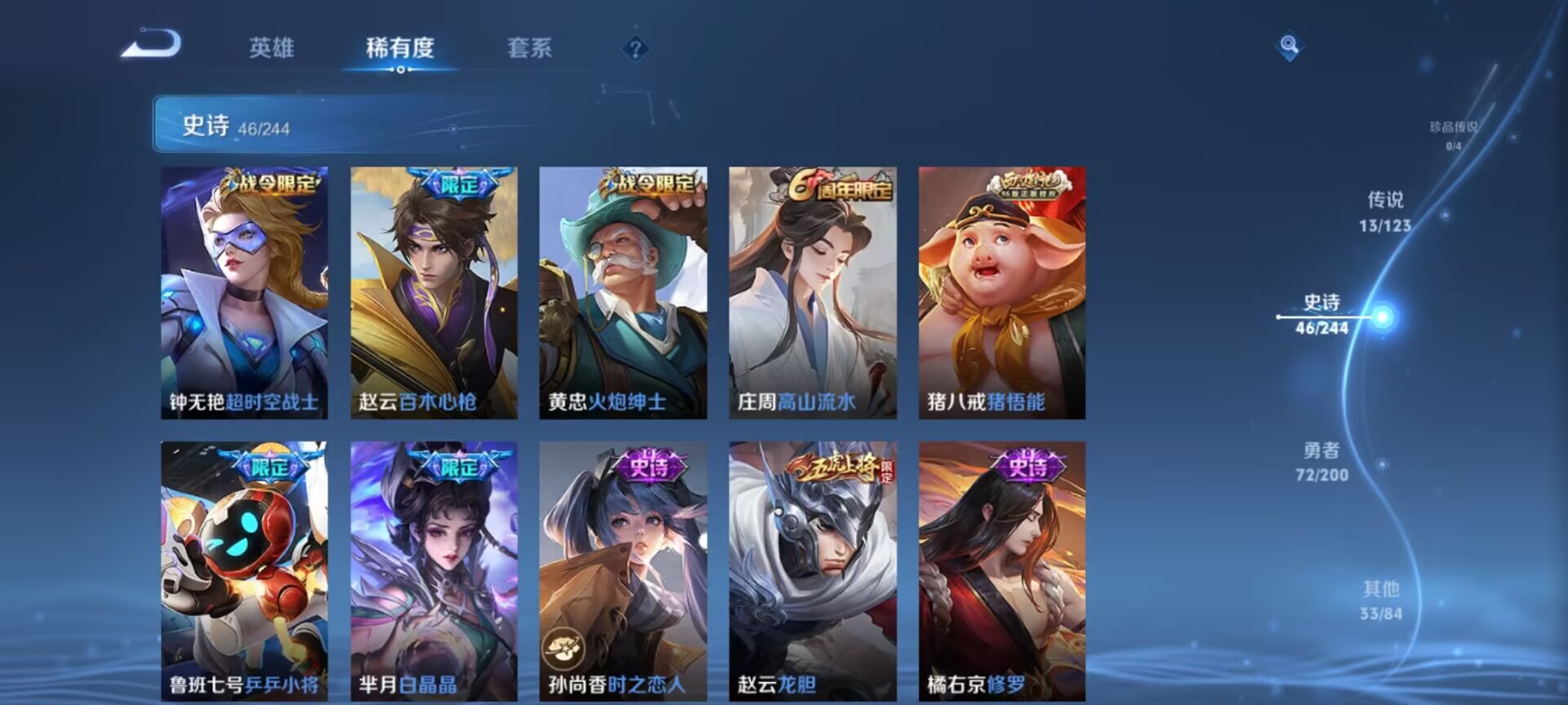 - PX_2108121-??信/尊贵铂金/539皮肤/124英雄/18典藏/0珍品无双/6无双/2珍品传说/96传说/189史诗/10稀有英雄 【2 珍品传说】怪盗基德 马可波罗,江户川柯南 鲁班七号, 【18 典藏皮肤】鸣剑·曳影 李白,全息碎影 孙悟空,杀手不太冷 孙尚香,天鹅之梦 小乔,活力突击 程咬金,倪克斯神谕 武则天,银白咏叹调 铠,幻阙歌 貂蝉,星空梦想 鲁班七号,神鉴启示录 虞姬,弑