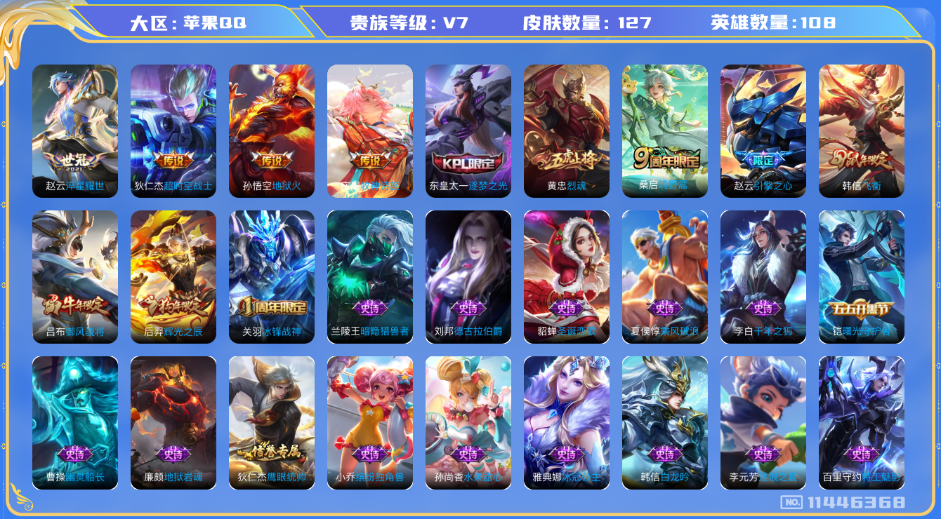 [11446368]V7 5传说 108英雄 127皮肤 可修改实名 优质装备:地狱火,淬星耀世,超时空战士-狄仁杰,牧神诗旅 限定皮:鸣野蒿,飞衡(韩信年限),冰锋战神,御风骁将(吕布年限),烈魂,逐梦之光,辉光之辰,引擎之心 史诗皮:紫霞仙子,白龙吟,黄金分割率,特工魅影,千年之狐,冰冠公主,修罗,水果甜心,天才门将,德古拉伯爵,暗隐猎兽者,幽灵船长,地狱岩魂,缤纷独角兽,乘风破浪,逐浪之夏,曙光守护者,圣诞恋歌,鹰眼统帅