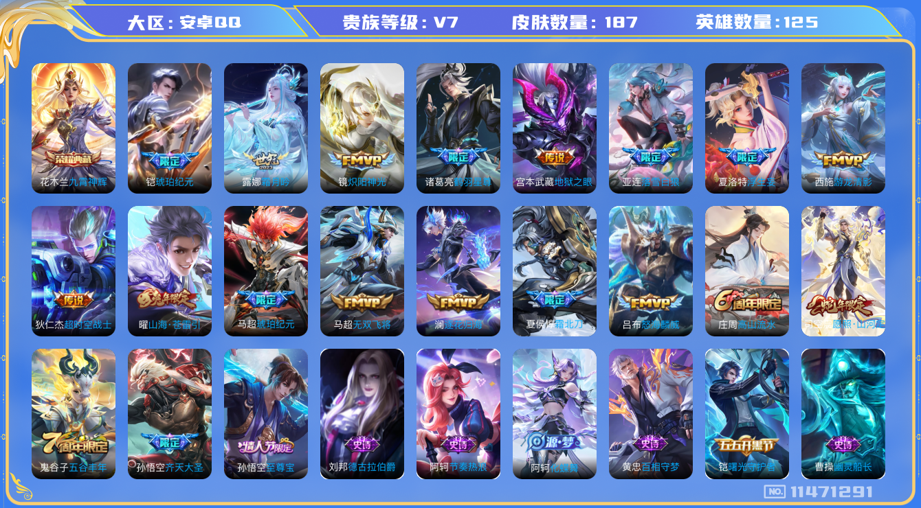 [11471291]V7 1典藏 17传说 125英雄 187皮肤 可修改实名 优质装备:九霄神辉(木兰典藏),炽阳神光,地狱之眼,游龙清影(小青龙),超时空战士-狄仁杰,无双飞将,山海·苍雷引(电光曜子),浮生妄,鹤羽星尊,霜月吟,澜逐花归海,琥珀纪元铠,琥珀纪元马超 传说皮:落雪白狼 珍宝阁皮:妄想食味,胡桃夹子 限定皮:愿照·山河定(司空震年限),夏侯惇霜北刀,至尊宝,高山流水,齐天大圣,怒海麟威,五谷丰年 史诗皮:鸭鸭历险记-刘禅,化蝶舞,星界战将,龙之律动,石田雨龙,茶境仙,蒙犽顽岩魄,琥珀纪元伽罗,百相守梦-百里守约,百相守梦-黄忠,紫霞仙子,电玩小子(小书包),白龙吟,特工魅影,江河有灵,百解令(蒙犽),蒙恬荣光圣徽,偶像歌手,冰冠公主,末日机甲-吕布,猫狗日记-孙策,节奏热浪,修罗,摇滚巨星,水果甜心,天才门将,星夜王子,心灵骇客,功夫厨神,德古拉伯爵,暗隐猎兽者,幽灵船长,鬼剑武藏,纤云弄巧,拒霜思,缤纷独角兽,逐浪之夏,水晶猎龙者,曙光守护者,唤灵魅影,金属风暴,原初追逐者,圣诞狂欢,鹰眼统帅,暗夜贵公子,魅力维加斯,无心