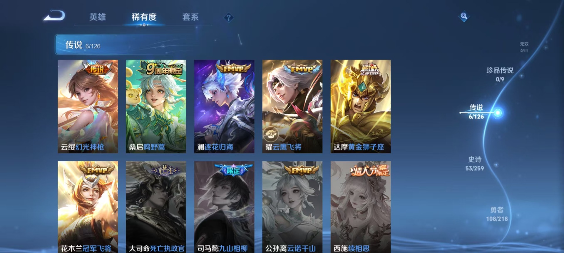 - [11881971]V9 3典藏 16传说 126英雄 325皮肤 典藏英雄武则天 可修改实名 荣耀水晶:神鉴启示录,全息碎影(猴子典藏),无限飓风号(高达) 传说皮:李逍遥,黄金射手座,仲夏夜之梦(大飞蛾),海洋之心,地狱之眼,一念神魔,淬星耀世,云鹰飞将(小将军),音你心动-周瑜,超时空战士-狄仁杰,音你闪耀(rap皮) 珍宝阁皮:优雅恋人,蔷薇恋人 限定皮:鸣野蒿,至尊宝,凤凰于飞,异界灵契(白毛香),白晶晶,时雨天司(水龙头),神威(电光马子),高山流水,五谷丰年,冰锋战神,天狼运算者,梁祝,御风骁将(吕布年限),天狼狩猎者,逐梦之星,天狼溯光者,奔雷神使(牛魔年限),李小龙,逐梦之光,朱雀志(守约年限),辉光之辰,霸王别姬-项羽,霸王别姬-虞姬,默契交锋-花木兰,冰霜恋舞曲,乒乒小将,蜜橘之夏,玉兔公主,深海之息(深海大菠萝),山海·玄木吟(马可年限) 史诗皮:星界战将,破空之剑,遇见神鹿,紫霞仙子,苍穹之光,电玩小子(小书包),白龙吟,黄金分割率,特工魅影,千年之狐,永昼,百解令(蒙犽),蒙恬荣光圣徽,冰冠公主,青蛇,偶像歌手,晚萤,魅语,暗夜猫娘,龙骑士(小龙虾),末日机甲-吕布,猫狗日记-孙策,猫狗日记-大乔,时之恋人-孙尚香,乱世虎臣,节奏热浪,修罗,女仆咖啡,摇滚巨星,水果甜心,绅士熊喵,天才门将,星夜王子,心灵骇客,功夫厨神,德古拉伯爵,暗隐猎兽者,幽灵船长,鬼剑武藏,心灵战警,舞动绿茵,地狱岩魂,纤云弄巧,繁星吟游(呼啦呼啦),拒霜思,缤纷独角兽,乘风破浪,逐浪之夏,水晶猎龙者,曙光守护者,箭羽风息,金属风暴,原初追逐者,圣诞狂欢,圣诞恋歌,鹰眼统帅,暗夜贵公子,魅力维加斯,黎明之约,赏金猎手,无心,未来纪元-赵云