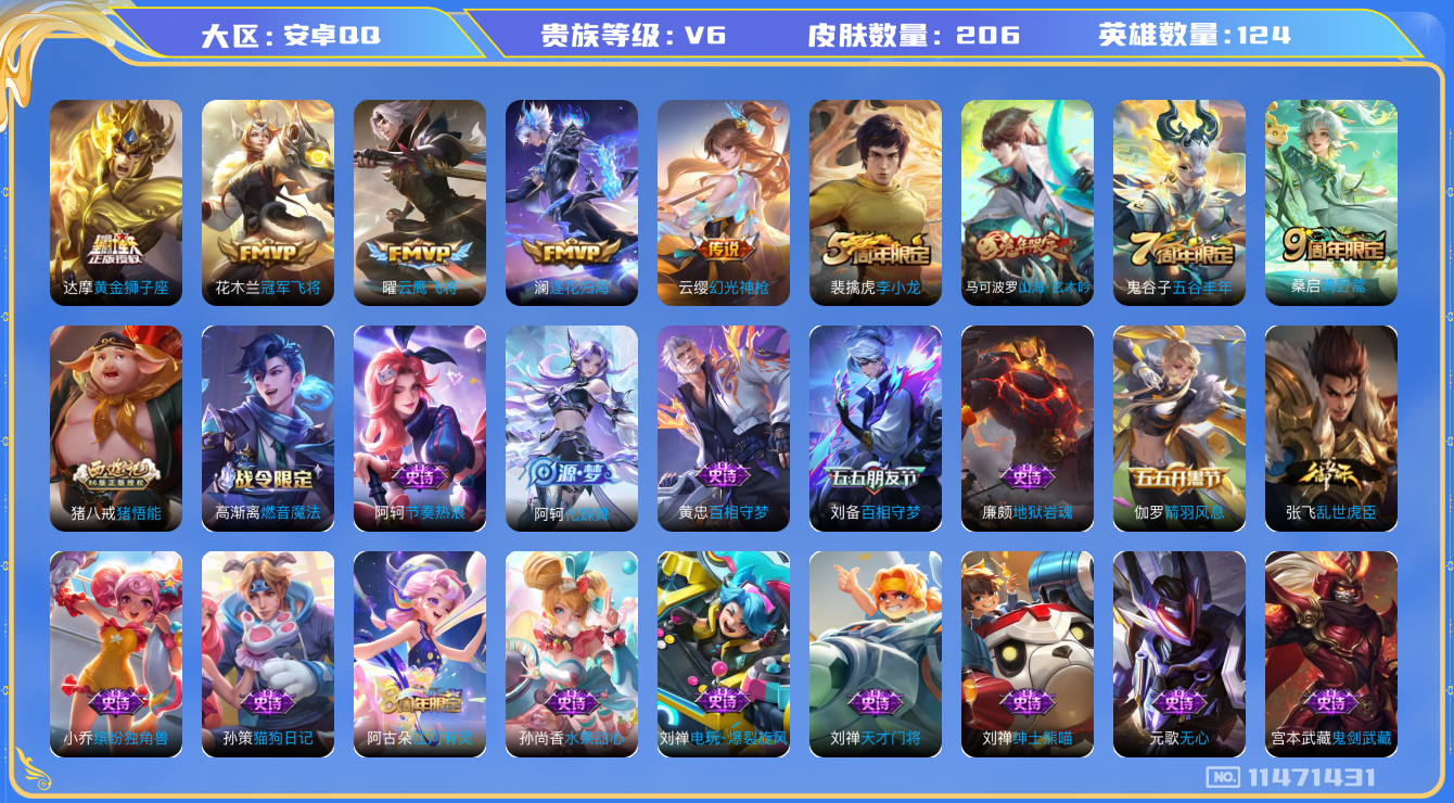 [11471431]V6 6传说 124英雄 206皮肤 可修改实名 优质装备:黄金狮子座,冠军飞将,云鹰飞将(小将军),澜逐花归海 传说皮:幻光神枪 珍宝阁皮:妄想食味,蔷薇恋人 限定皮:鸣野蒿,五谷丰年,李小龙,猪悟能,山海·玄木吟(马可年限) 史诗皮:化蝶舞,龙之律动,破空之剑,谪仙醉月,决胜骁骑,百相守梦-黄忠,特工魅影,千年之狐,百相守梦(刘备),电玩·爆裂旋风,真我赫兹(百里守约),江河有灵,百解令(蒙犽),高渐离燃音魔法,偶像歌手,冰冠公主,猫狗日记-孙策,乱世虎臣,节奏热浪,女仆咖啡,水果甜心,绅士熊喵,天才门将,星夜王子,心灵骇客,暗隐猎兽者,鬼剑武藏,心灵战警,地狱岩魂,纤云弄巧,拒霜思,缤纷独角兽,逐浪之夏,箭羽风息,金属风暴,圣诞恋歌,鹰眼统帅,魅力维加斯,无心,未来纪元-赵云