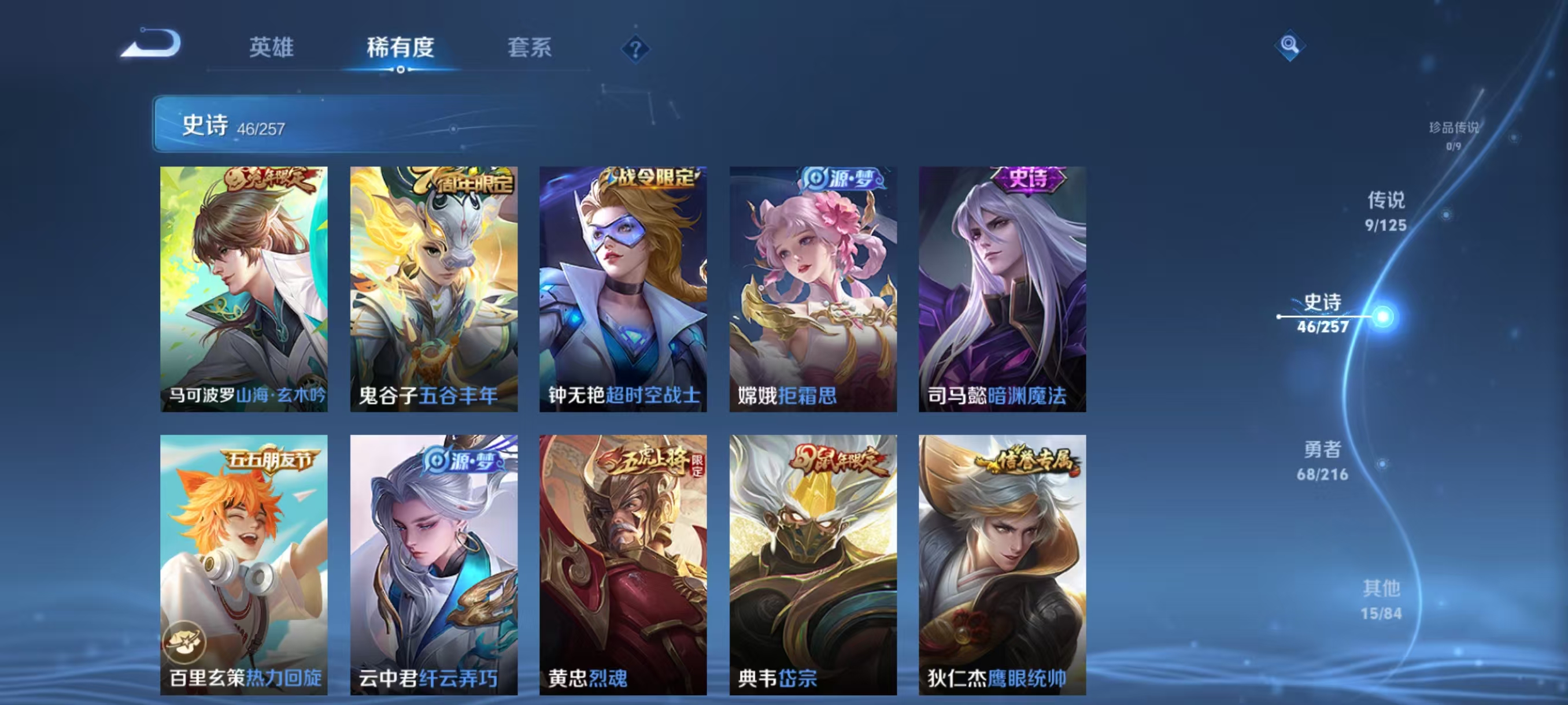 大乔猫狗日记,诸葛亮黄金分割率,韩信白龙吟,嬴政摇滚巨星,刘禅绅士熊喵,刘禅天才门将,刘邦德古拉伯爵,兰陵王暗隐猎兽者,宫本武藏鬼剑武藏,司马懿暗渊魔法,亚瑟心灵战警,廉颇地狱岩魂,夏侯惇乘风破浪,花木兰水晶猎龙者,铠曙光守护者,百里玄策热力回旋,墨子金属风暴,百里守约特工魅影,嬴政暗夜贵公子,嫦娥拒霜思,李元芳匿光侦查者,蒙犽百解令,伽罗琥珀纪元,狄仁杰绮世丹青