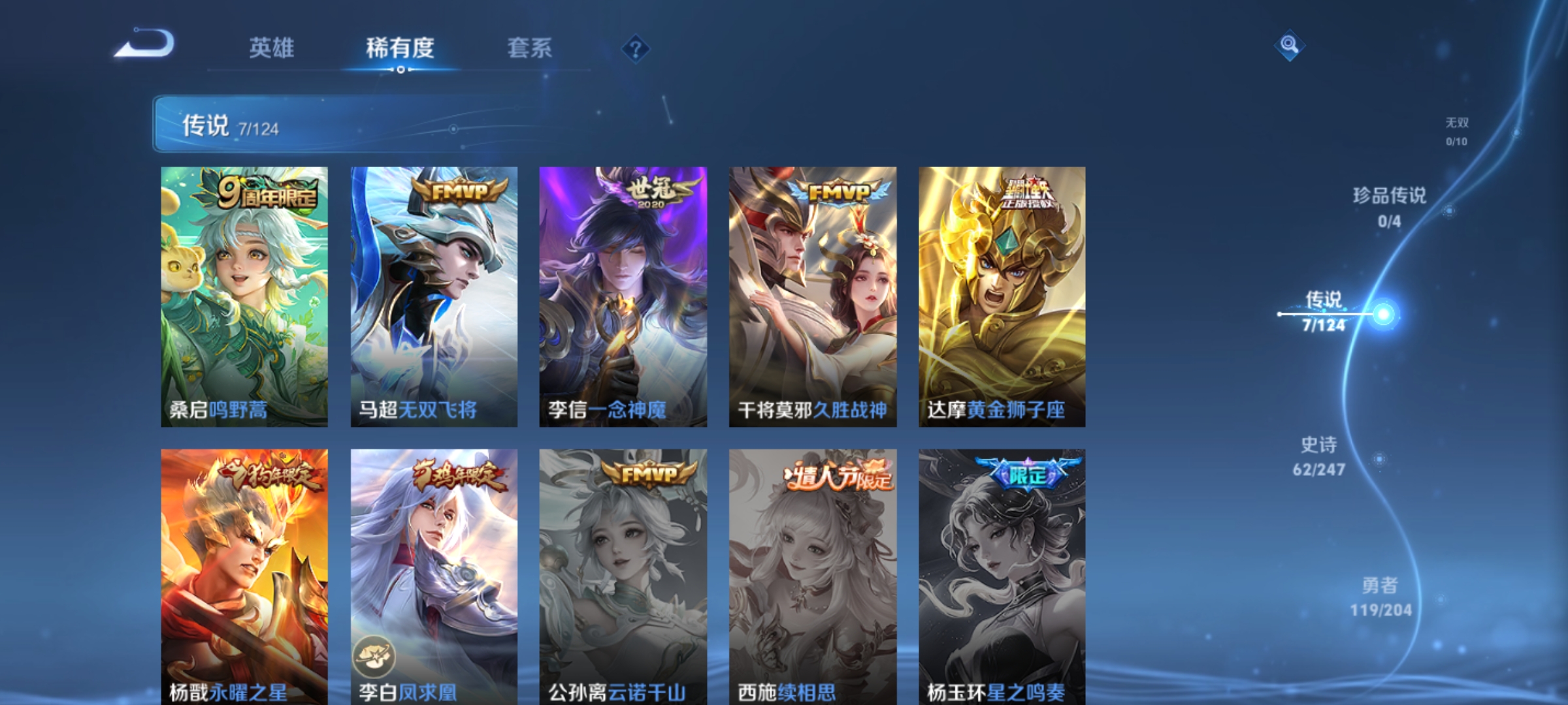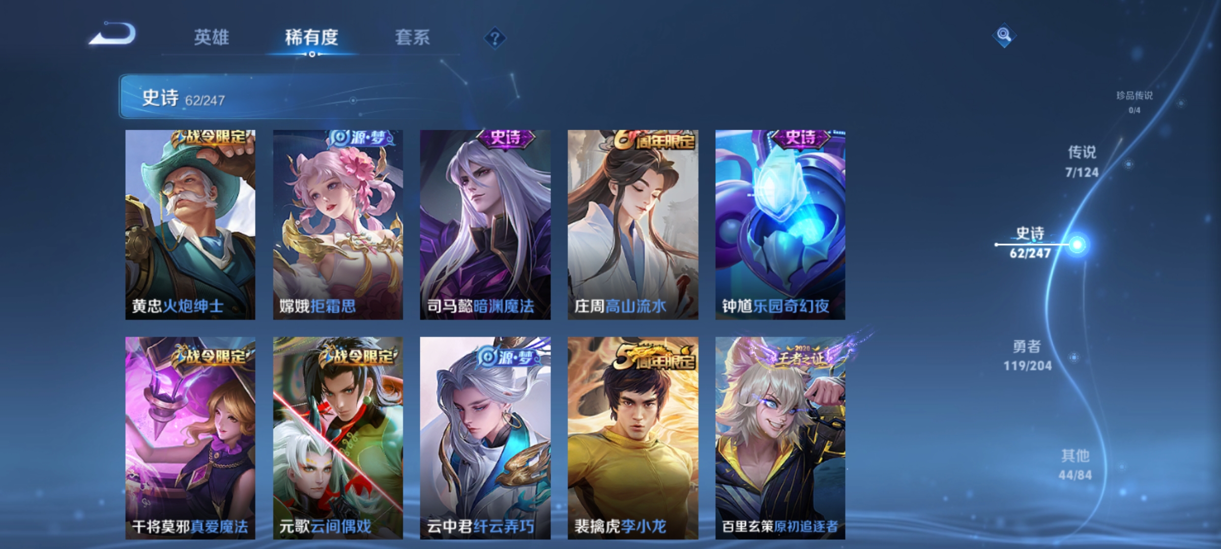 孙膑妖精王,扁鹊炼金王,虞姬凯尔特女王,白起狰,太乙真人饕餮,曹操烛龙,典韦穷奇,狂铁御狮,米莱狄御霄,牛魔御旌,盾山御銮,夏侯惇朔风刀,明世隐疑决卦,老夫子醍醐杖,鬼谷子原初探秘者,狄仁杰万华元夜,程咬金演武夺筹,钟馗驱傩正仪,苏烈千军破阵,吕布猎兽之王,钟馗神迹守卫,鲁班七号狮舞东方,沈梦溪星空之诺,李元芳银河之约,马可波罗暗影游猎,蒙犽狂想玩偶喵,元歌云间偶戏,弈星混沌棋,达摩沙漠行僧,兰陵王金庭之子,沈梦溪大漠名商,李元芳云中旅人,桑启海盐诗旅,裴擒虎擒涛扼浪,鲁班大师探海日志,张良古海寻踪