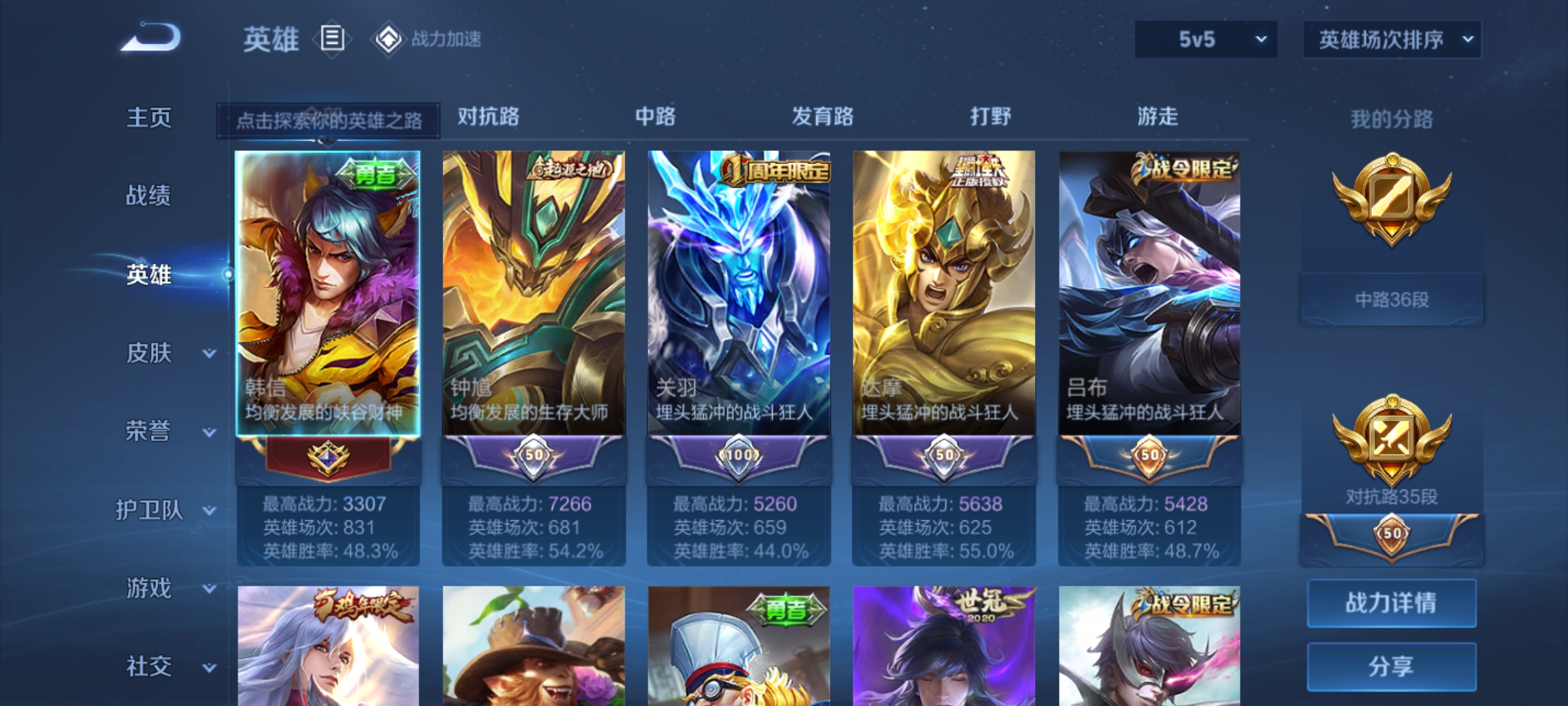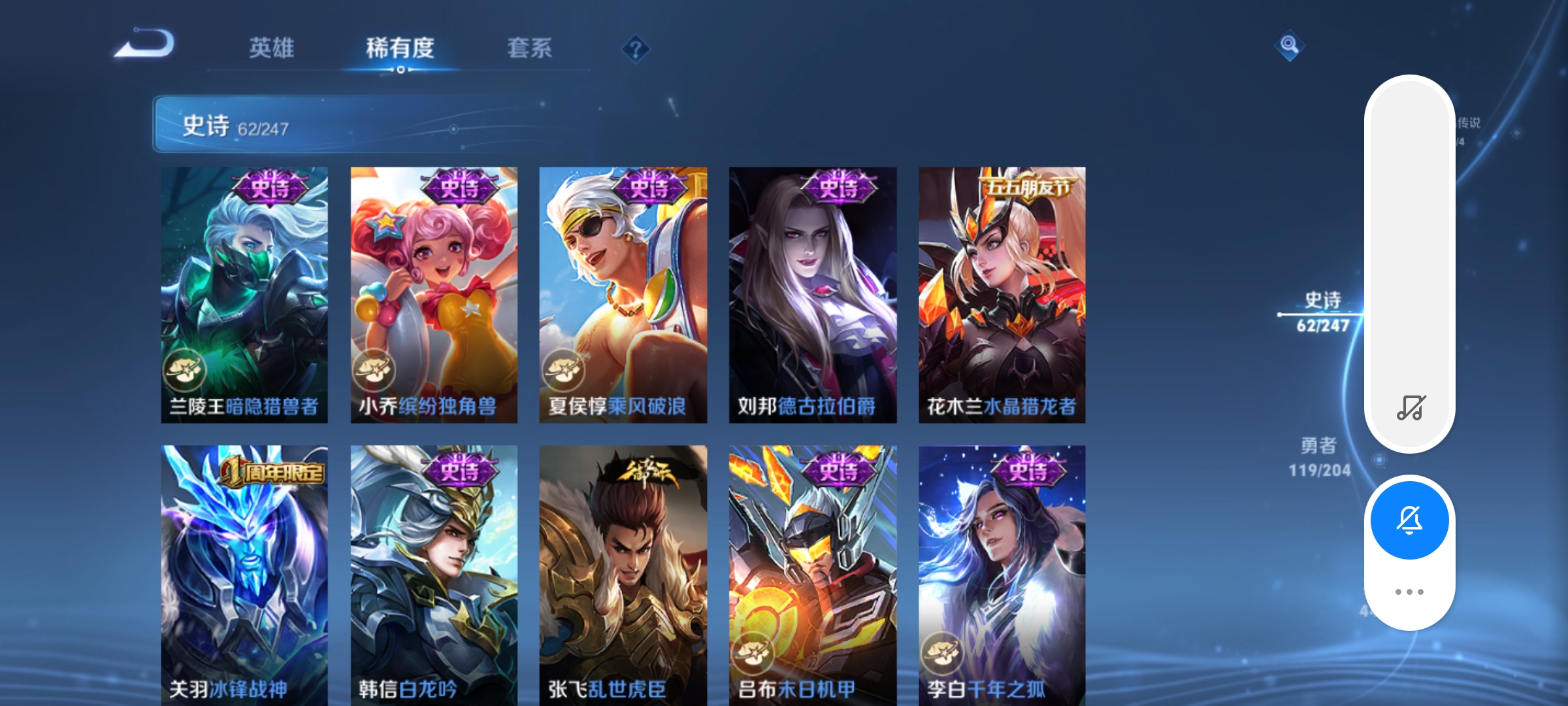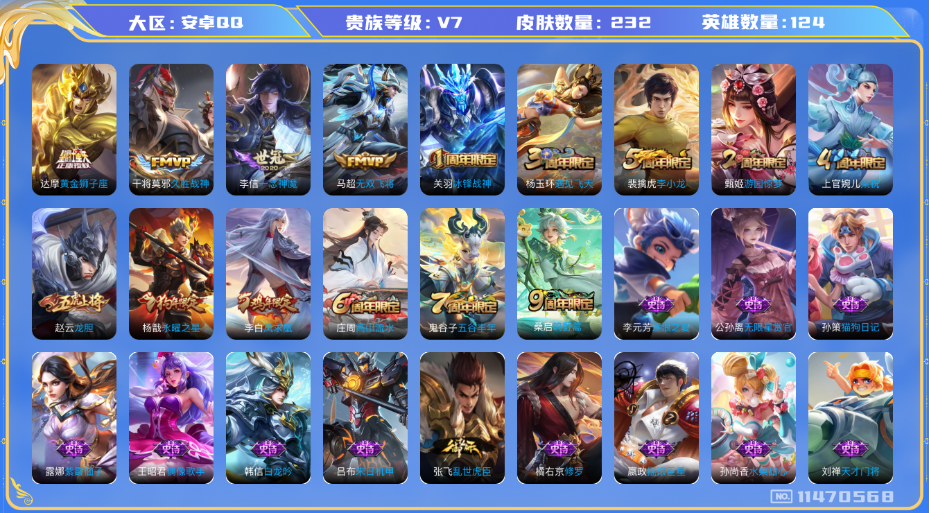 - PX_2071293-贵族等级: V8 英雄数: 123 皮肤数: 245 荣耀水晶: 鸣剑·曳影 星传说: 未来机甲 传说皮: 云鹰飞将,久胜战神,炽阳神光,一念神魔,末日机甲-孙尚香,时之恋人-刘备,淬星耀世,末日机甲-孙策,挚爱之约,无双飞将,山海·炽霜斩,浮生妄,记忆之芯,鹤羽星尊,妄想奇谈,惊梅引,霜月吟,乘龙·淬吴钩,幻光神枪 限定皮: 李小龙,御风骁将,武圣,岱宗,天狼狩猎者,美猴王