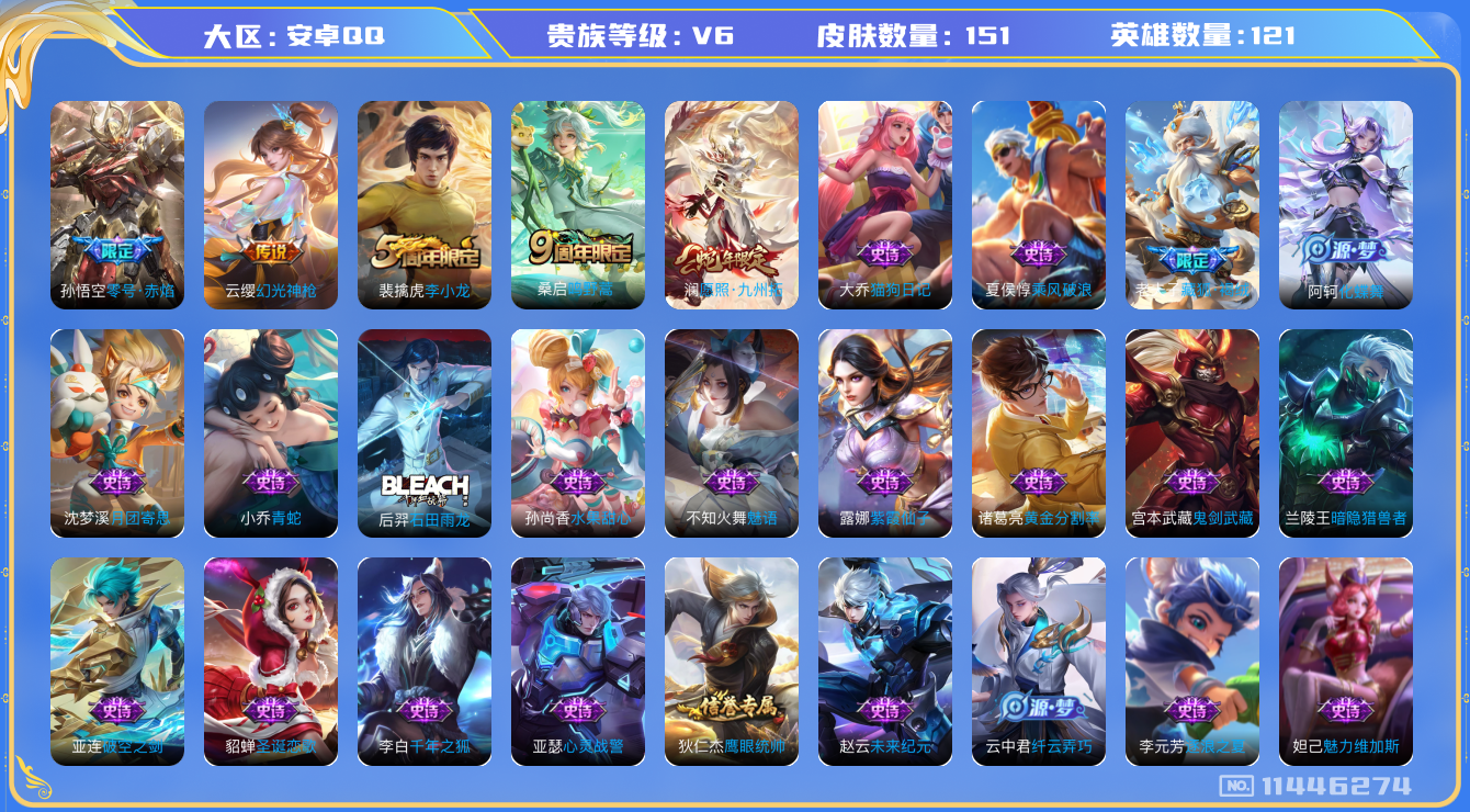 [11446274]V6 4传说 121英雄 151皮肤 可修改实名 优质装备:零号·赤焰 传说皮:幻光神枪 珍宝阁皮:胡桃夹子 限定皮:愿照·九州拓(澜年限),鸣野蒿,李小龙 史诗皮:化蝶舞,龙之律动,藏狐·褐绒,石田雨龙,破空之剑,紫霞仙子,黄金分割率,千年之狐,偶像歌手,魅语,青蛇,猫狗日记-大乔,水果甜心,暗隐猎兽者,鬼剑武藏,心灵战警,纤云弄巧,乘风破浪,逐浪之夏,月团寄思,圣诞恋歌,鹰眼统帅,魅力维加斯,未来纪元-赵云