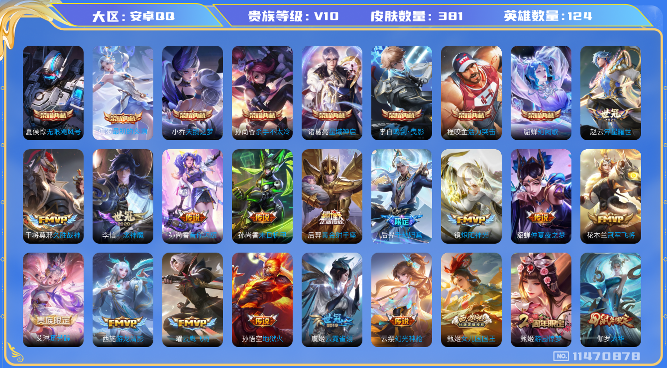 [11470878]V10 8典藏 24传说 124英雄 381皮肤 可修改实名 优质装备:天鹅之梦(小乔典藏),无限飓风号(高达),活力突击,杀手不太冷,鸣剑·曳影,星域神启(倪克斯贼亮),幻阙歌(貂蝉典藏),最初的交响(伽罗典藏),黄金射手座,冠军飞将,云鹰飞将(小将军),久胜战神,炽阳神光,一念神魔,云霓雀翎,末日机甲-孙尚香(绿蚂蚱),地狱火,仲夏夜之梦(大飞蛾),游龙清影(小青龙),淬星耀世,音你闪耀(rap皮),艾琳觅芳踪,千劫归真,涂山容容 传说皮:幻光神枪 珍宝阁皮:万物之道,优雅恋人,蔷薇恋人,女武神 限定皮:愿照·众生和(妲己年限),鸣野蒿,至尊宝,白虎志(电光耗子),凤求凰(白切鸡),太华(伽罗年限),武陵仙君(小桃花),傲雪梅枪,时之彼端,神威(电光马子),飞衡(韩信年限),遇见飞天,高山流水,五谷丰年,冰锋战神,游园惊梦,梁祝,逐梦之星,岱宗(典韦年限),李小龙,逐梦之影,天魔缭乱,青春决赛季,匿光追影者,女儿国国王 史诗皮:器灵·浮梦炉,灵蛊蚀心,龙之律动,石田雨龙,茶境仙,百相守梦-黄忠,织梦人,遇见神鹿,紫霞仙子,苍穹之光,电玩小子(小书包),白龙吟,黄金分割率,特工魅影,千年之狐,魅语,高渐离燃音魔法,无限星赏官,冰冠公主,青蛇,偶像歌手,白蛇,晚萤,暗夜猫娘,龙骑士(小龙虾),末日机甲-吕布,猫狗日记-孙策,猫狗日记-大乔,时之恋人-孙尚香,乱世虎臣,节奏热浪,修罗,女仆咖啡,摇滚巨星,水果甜心,绅士熊喵,天才门将,星夜王子,心灵骇客,时之奇旅-安琪拉,功夫厨神,德古拉伯爵,暗隐猎兽者,幽灵船长,鬼剑武藏,暗渊魔法,心灵战警,天秀·启明,舞动绿茵,地狱岩魂,诗语江南,纤云弄巧,繁星吟游(呼啦呼啦),拒霜思,缤纷独角兽,乘风破浪,逐浪之夏,龙鼓争鸣,月团寄思,水晶猎龙者,曙光守护者,箭羽风息,金属风暴,原初追逐者,圣诞狂欢,圣诞恋歌,鹰眼统帅,暗夜贵公子,魅力维加斯,黎明之约,赏金猎手,无心,未来纪元-赵云