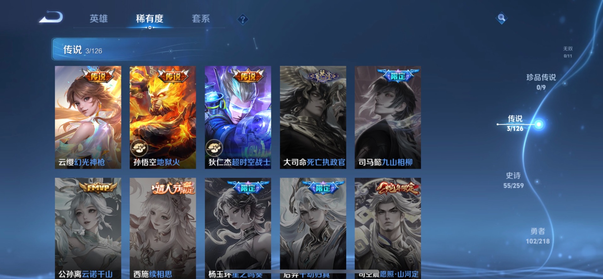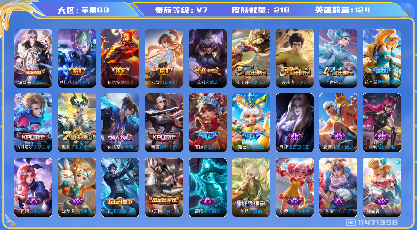 [11471398]V7 1典藏 3传说 124英雄 218皮肤 可修改实名 优质装备:星域神启(倪克斯贼亮),地狱火,超时空战士-狄仁杰 传说皮:幻光神枪 珍宝阁皮:优雅恋人,女武神 限定皮:至尊宝,遇见飞天,五谷丰年,梁祝,逐梦之星,李小龙,逐梦之影,玄武志(苏烈年限),霸王别姬-虞姬,青春决赛季,热情桑巴 史诗皮:茶境仙,蔬乡物语(鲁班七号),紫霞仙子,白龙吟,黄金分割率,特工魅影,千年之狐,偶像歌手,暗夜猫娘,晚萤,末日机甲-吕布,猫狗日记-孙策,节奏热浪,摇滚巨星,水果甜心,绅士熊喵,天才门将,星夜王子,心灵骇客,功夫厨神,德古拉伯爵,暗隐猎兽者,幽灵船长,鬼剑武藏,心灵战警,舞动绿茵,缤纷独角兽,乘风破浪,逐浪之夏,月团寄思,水晶猎龙者,曙光守护者,原初追逐者,圣诞狂欢,圣诞恋歌,鹰眼统帅,王者之锤,魅力维加斯,未来纪元-赵云