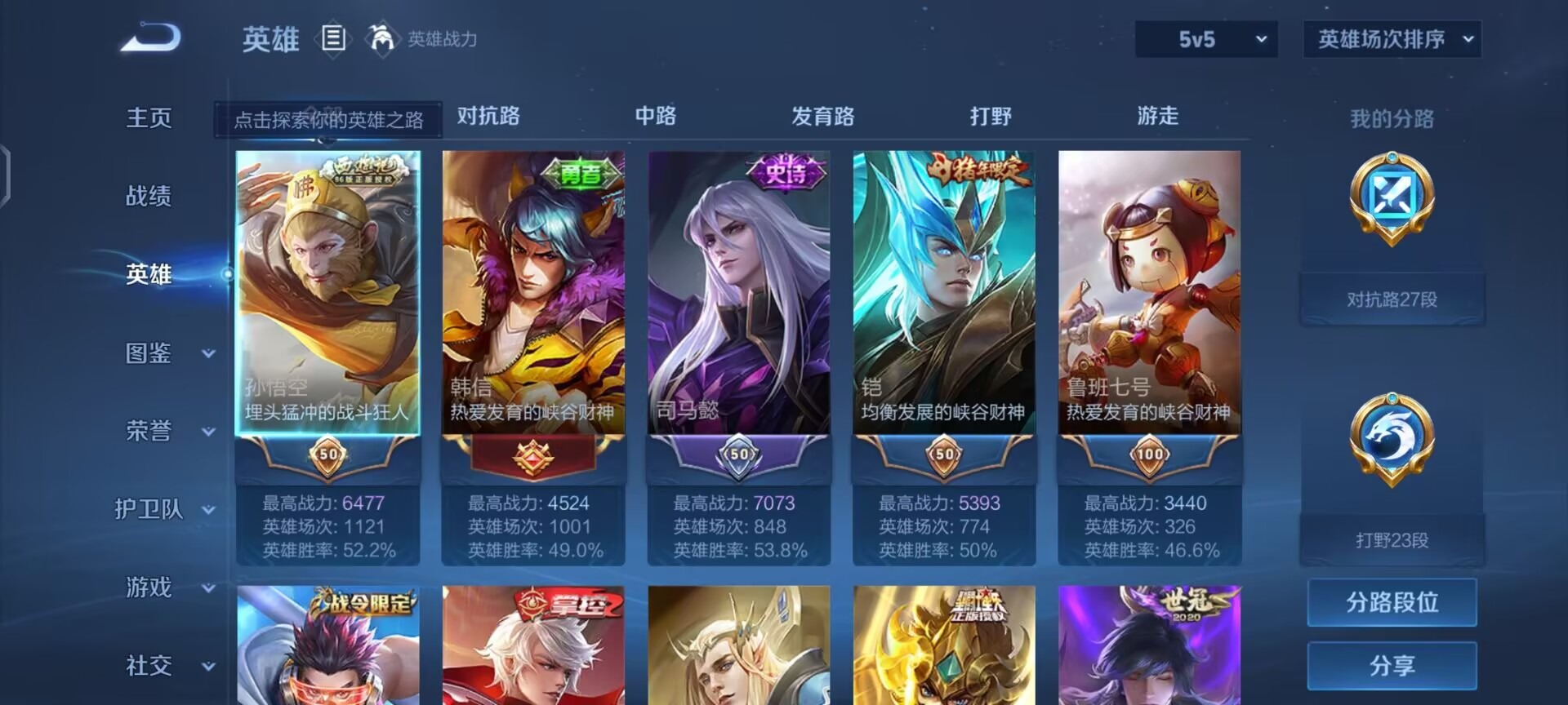 - PX_2057207-贵族等级: V7 英雄数: 124 皮肤数: 227 星传说: 零号·雷霆 传说皮: 炽阳神光,末日机甲-孙尚香,零号·赤焰,霜月吟,牧神诗旅,祥瑞亨通 限定皮: 冰锋战神,李小龙,御风骁将,神威,时之彼端,飞衡,天狼绘梦者,至尊宝,孙行者,鸣野蒿,逐霄战戟,愿照·九州拓