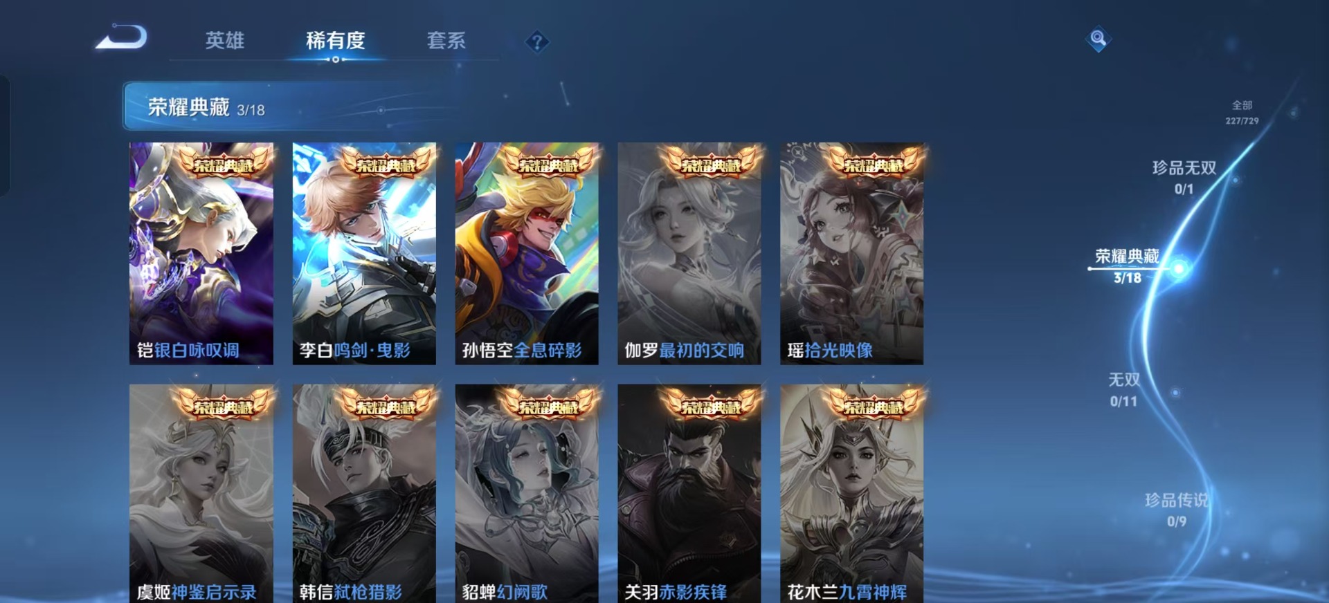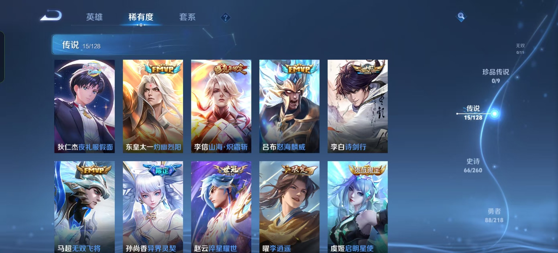 - PX_2099906-55 安卓QQ/至尊星耀/257皮肤/123英雄/1典藏/0珍品无双/0无双/2珍品传说/6传说/61史诗/7稀有英雄 【2 珍品传说】大耳狗之梦 瑶,器灵·落星盏 嫦娥, 【1 典藏皮肤】拾光映像 瑶, 【6 传说皮肤】时之祈愿 瑶,游龙清影 西施,祈雪灵祝 公孙离,绯月行 不知火舞,鸣野蒿 桑启,云诺千山 公孙离, 【61 史诗皮肤】末日机甲 吕布,紫霞仙子 露娜,高山流