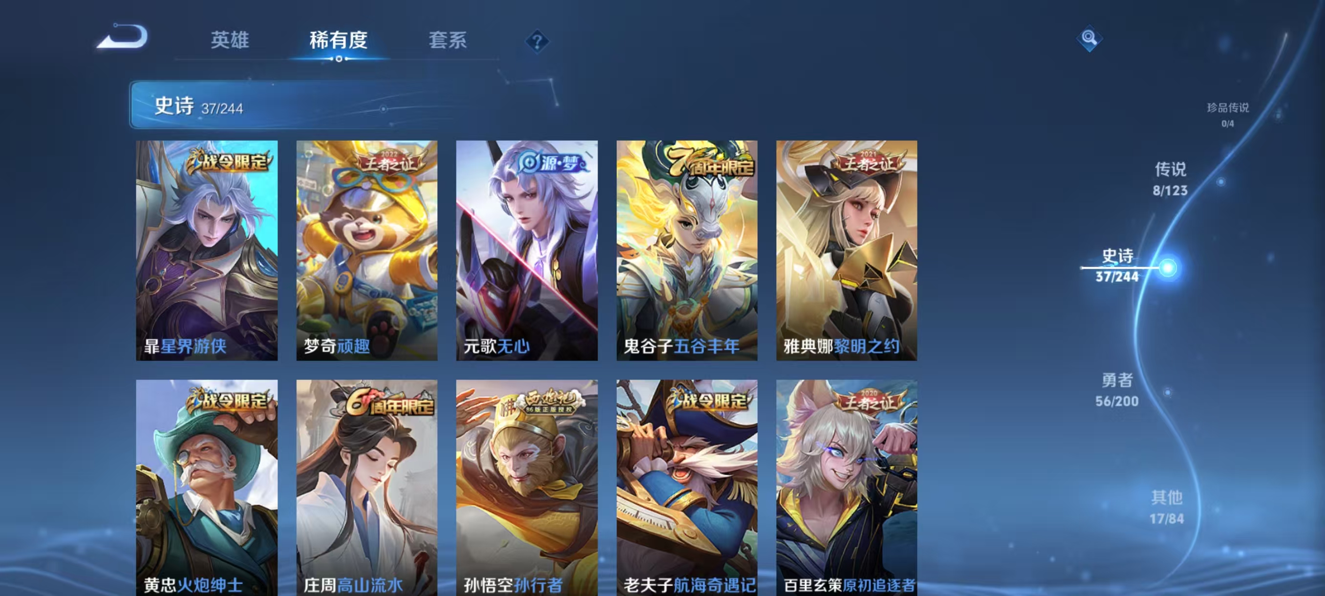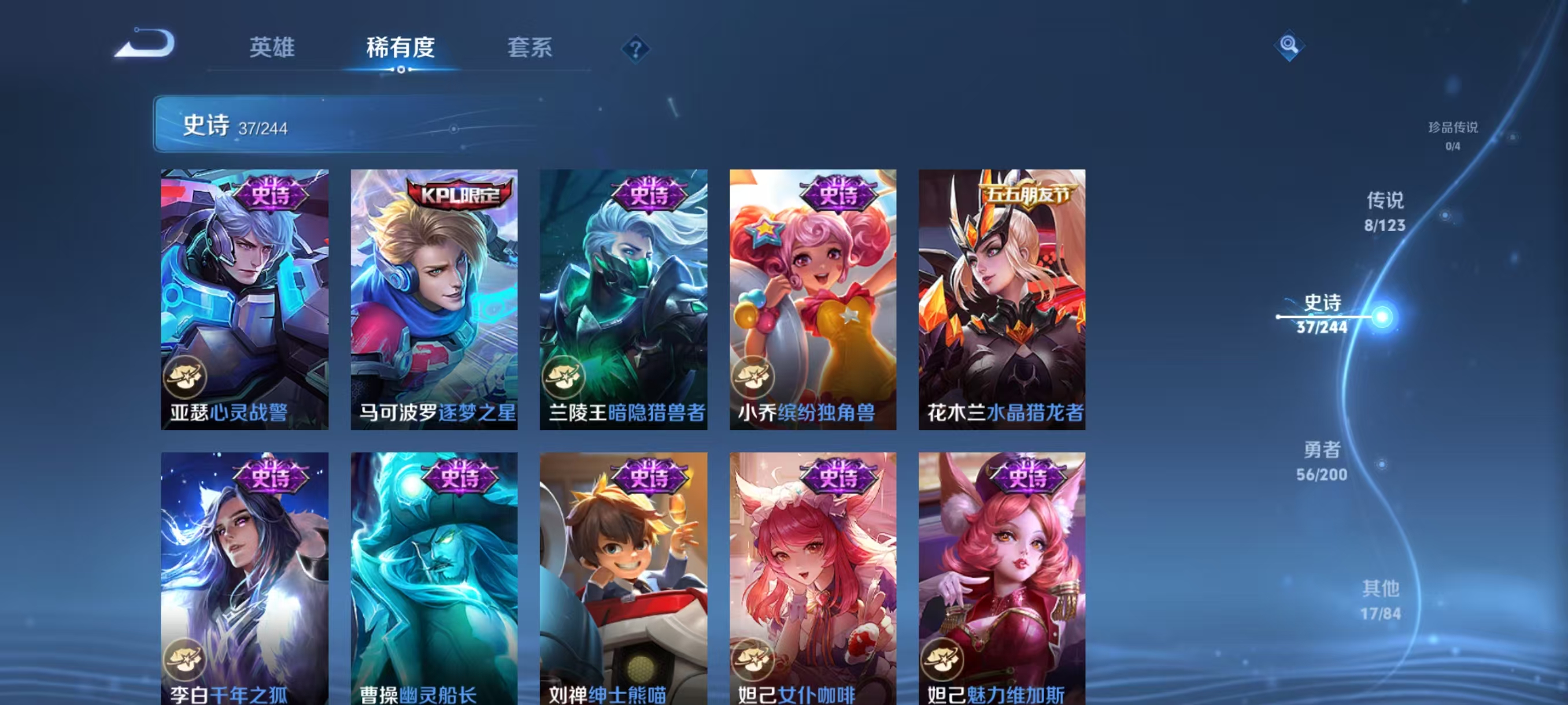 - [11605083]V6 8传说 124英雄 214皮肤 可修改实名 优质装备:猫影幻舞,炽阳神光,李逍遥,无双飞将,记忆之芯(机甲兔),澜逐花归海 珍宝阁皮:胡桃夹子,优雅恋人 限定皮:愿照·九州拓(澜年限),遇见飞天,诗剑行,五谷丰年,游园惊梦,李小龙,山海·玄木吟(马可年限) 史诗皮:器灵·浮梦炉,化蝶舞,龙之律动,战舞者,紫霞仙子,特工魅影,蒙恬荣光圣徽,晚萤,猫狗日记-孙策,乱世虎臣,修罗,摇滚巨星,水果甜心,绅士熊喵,天才门将,星夜王子,暗隐猎兽者,鬼剑武藏,地狱岩魂,纤云弄巧,繁星吟游(呼啦呼啦),乘风破浪,水晶猎龙者,金属风暴,原初追逐者,圣诞恋歌,鹰眼统帅,魅力维加斯,黎明之约,赏金猎手,滕王阁序,无心