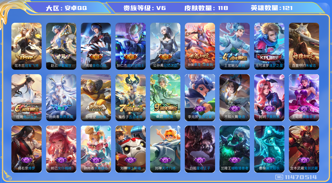[11470514],-可二次-121英雄-118皮肤-8传说-37史诗 淬星耀世-赵云 异界灵契-孙尚香 女武神-艾琳 街头霸王-韩信
