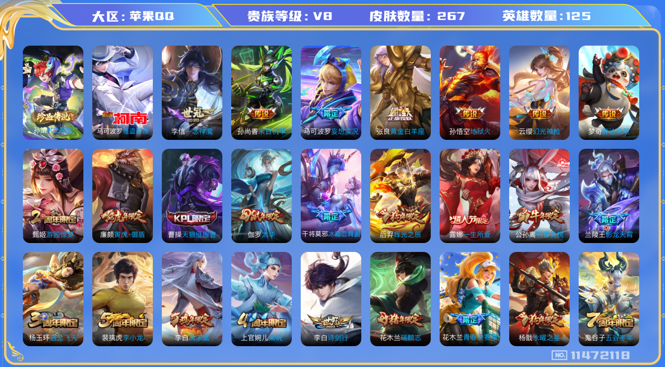 [11472118]V8 2珍品传说 17传说 125英雄 267皮肤 可修改实名 珍品传说:怪盗基德,时之奇旅-孙策 传说皮:幻光神枪,黄金白羊座,地狱火,末日机甲-孙尚香(绿蚂蚱),一念神魔,胖达荣荣,妄想实况 珍宝阁皮:妄想食味 限定皮:愿照·九州拓(澜年限),鸣野蒿,白虎志(电光耗子),凤求凰(白切鸡),太华(伽罗年限),傲雪梅枪,飞衡(韩信年限),瑞麟志(木兰年限),影龙天霄,遇见飞天,诗剑行,五谷丰年,冰锋战神,游园惊梦,梁祝,天狼征服者,祈雪灵祝(雪兔子),李小龙,永曜之星,辉光之辰,霸王别姬-虞姬,一生所爱,大圣娶亲,引擎之心,青春决赛季,冰霜恋舞曲,寅虎·御盾(廉颇年限) 史诗皮:星界战将,茶境仙,绮世丹青,龙之律动,石田雨龙,琥珀纪元伽罗,破空之剑,紫霞仙子,黄金分割率,特工魅影,千年之狐,永昼,魅语,暗夜猫娘,龙骑士(小龙虾),猫狗日记-孙策,乱世虎臣,节奏热浪,修罗,女仆咖啡,水果甜心,绅士熊喵,星夜王子,心灵骇客,功夫厨神,德古拉伯爵,暗隐猎兽者,鬼剑武藏,缤纷独角兽,逐浪之夏,水晶猎龙者,金属风暴,原初追逐者,圣诞狂欢,圣诞恋歌,鹰眼统帅,王者之锤,魅力维加斯,寅虎·御盾