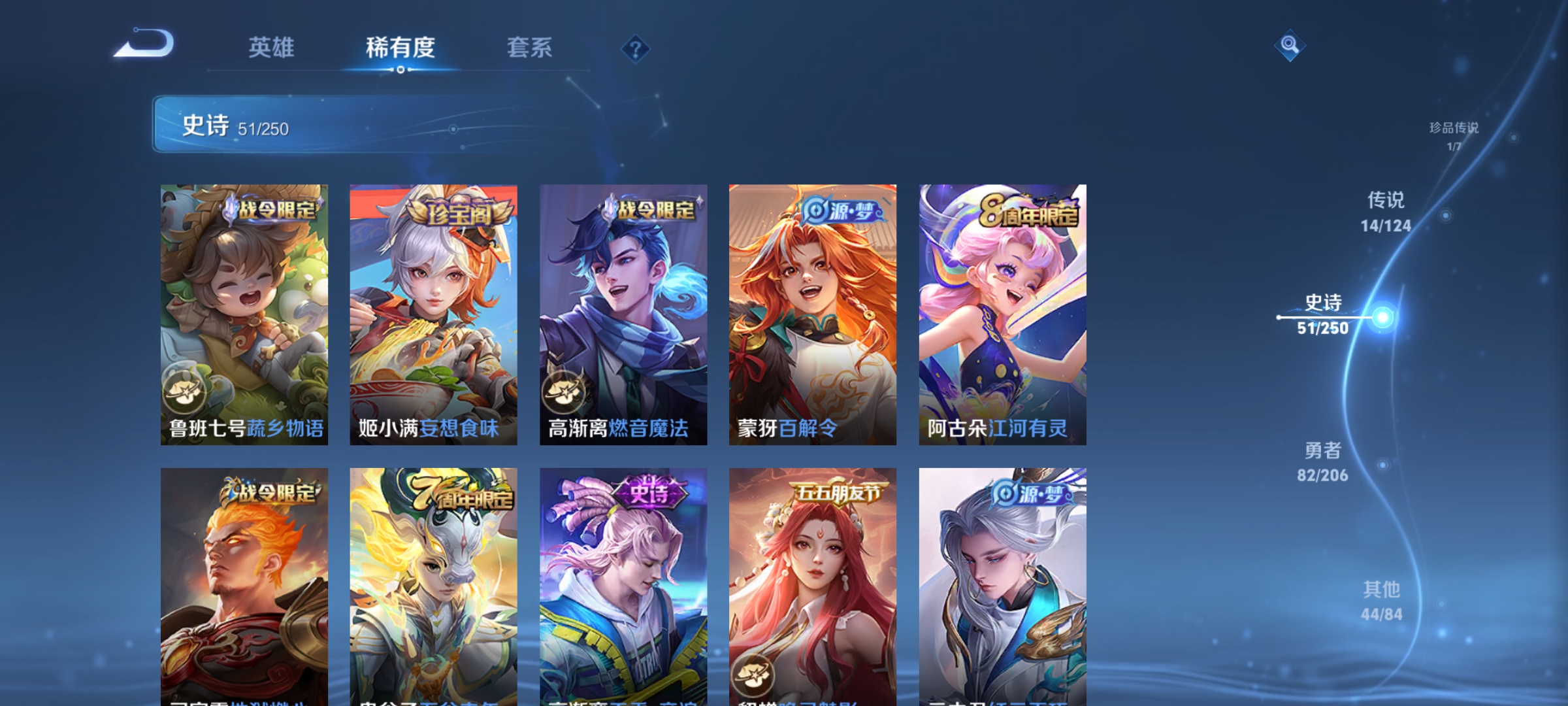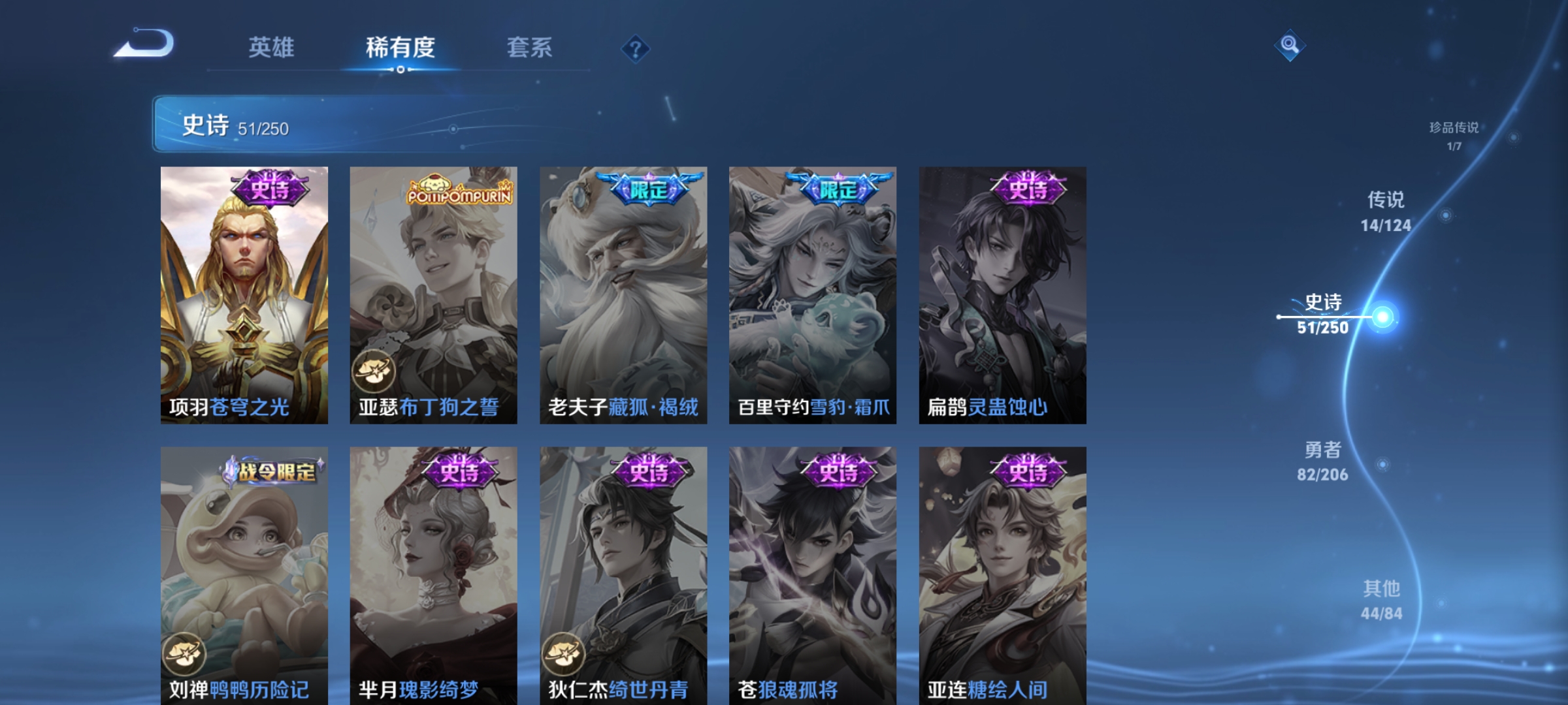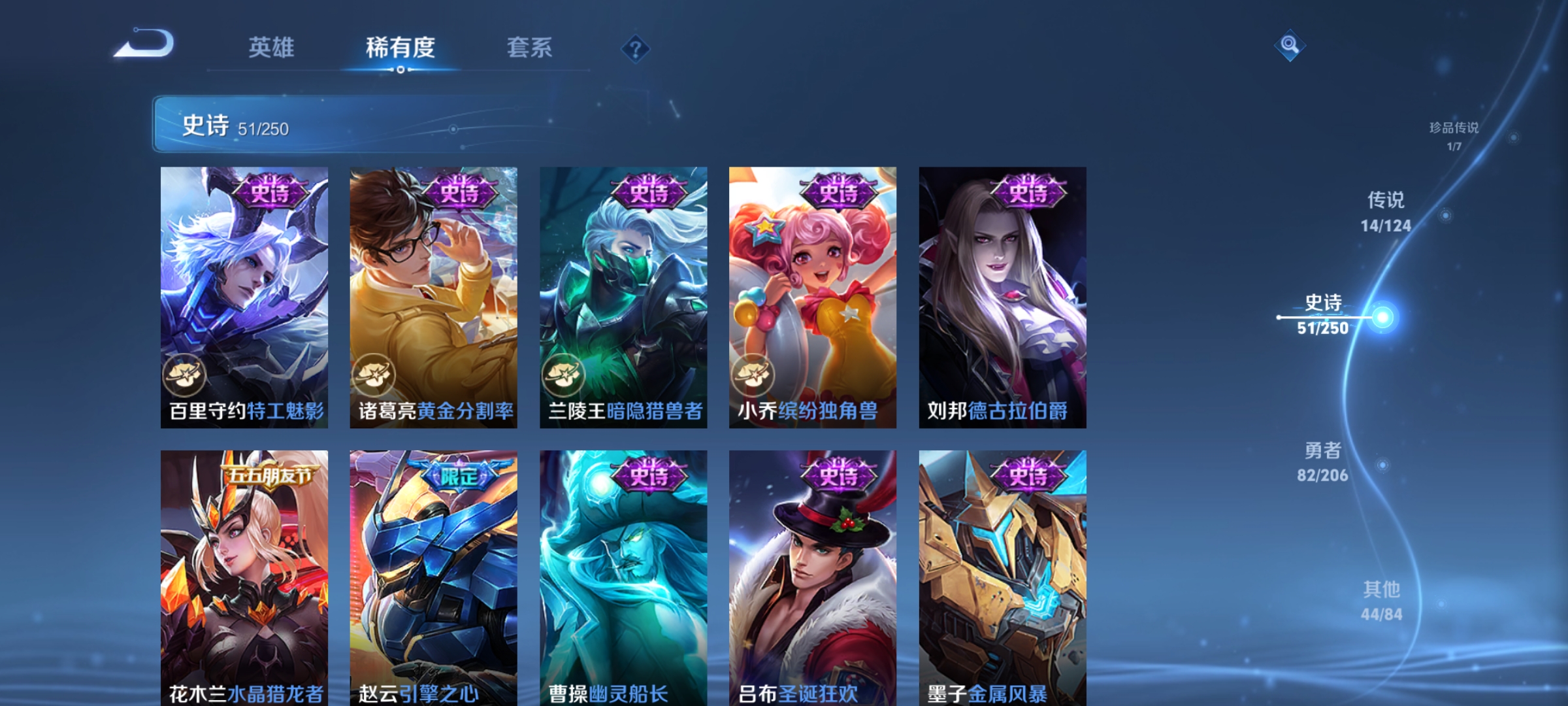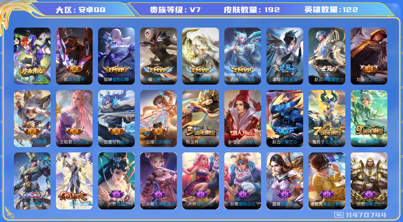 - [11608937]V7 1典藏 7传说 125英雄 291皮肤 可修改实名 优质装备:神鉴启示录,炽阳神光,浮生妄,霜月吟,澜逐花归海 传说皮:落雪白狼 珍宝阁皮:妄想食味,优雅恋人,蔷薇恋人 限定皮:愿照·千秋盛(女娲年限),陌上桑,鸣野蒿,至尊宝,傲雪梅枪,遇见飞天,五谷丰年,龙胆,李小龙,猪悟能,引擎之心,美猴王 史诗皮:器灵·浮梦炉,星界战将,撼地雄心,破空之剑,战舞者,东方月初,埋骨钱,芈月浮光幕影,决胜骁骑,蔬乡物语(鲁班七号),百相守梦-百里守约,百相守梦-黄忠,特工魅影,千年之狐,江河有灵,匿光侦查者,鹤归松栖(赵怀真),雪夜绮愿(周瑜),真我赫兹(镜),百解令(蒙犽),高渐离燃音魔法,蒙恬荣光圣徽,匿光破解者,偶像歌手,暗夜猫娘,末日机甲-吕布,猫狗日记-孙策,节奏热浪,修罗,女仆咖啡,摇滚巨星,水果甜心,天才门将,星夜王子,心灵骇客,德古拉伯爵,暗隐猎兽者,鬼剑武藏,天秀·启明,纤云弄巧,拒霜思,缤纷独角兽,乘风破浪,逐浪之夏,月团寄思,水晶猎龙者,金属风暴,原初追逐者,圣诞狂欢,鹰眼统帅,魅力维加斯,赏金猎手,无心,未来纪元-赵云