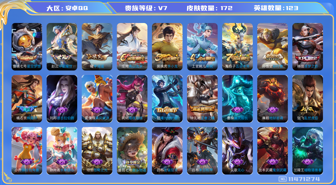 [11471274]V7 1典藏 3传说 123英雄 172皮肤 可修改实名 优质装备:星空梦想(太空人),李逍遥,淬星耀世 珍宝阁皮:胡桃夹子,优雅恋人 限定皮:高山流水,五谷丰年,梁祝,李小龙,逐梦之影,孙行者,枫霜尽 史诗皮:蔬乡物语(鲁班七号),苍穹之光,千年之狐,偶像歌手,暗夜猫娘,冰冠公主,末日机甲-吕布,乱世虎臣,女仆咖啡,水果甜心,星夜王子,心灵骇客,功夫厨神,德古拉伯爵,暗隐猎兽者,幽灵船长,鬼剑武藏,心灵战警,舞动绿茵,地狱岩魂,纤云弄巧,缤纷独角兽,乘风破浪,逐浪之夏,水晶猎龙者,曙光守护者,金属风暴,圣诞狂欢,圣诞恋歌,鹰眼统帅,王者之锤,无心