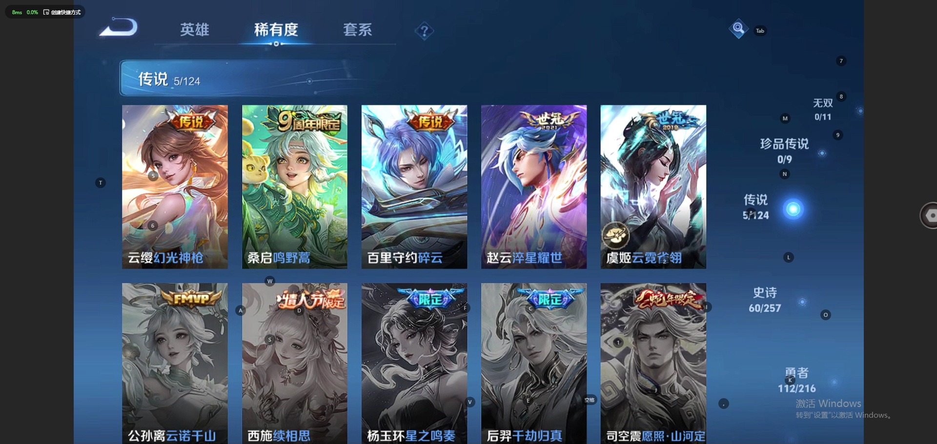 - PX_2072991-贵族等级: V7 英雄数: 114 皮肤数: 112 荣耀水晶: 最初的交响 无双皮: 雪境奇遇-甄姬 珍品传说: 时之奇旅-孙策,器灵·落星盏 传说皮: 铠冥王哈迪斯,幻光神枪 限定皮: 降魔,鸣野蒿,陌上桑,逐霄战戟,愿照·岁时盈,愿照·福禄聚