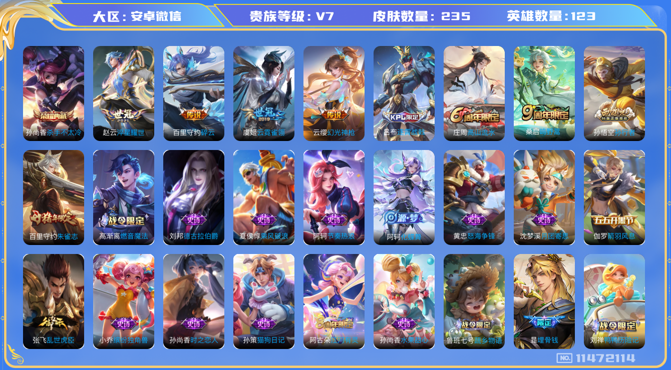 [11472114]V7 1典藏 5传说 123英雄 235皮肤 可修改实名 安全保护中 荣耀水晶:杀手不太冷 传说皮:幻光神枪,云霓雀翎,淬星耀世,碎云 珍宝阁皮:妄想食味 限定皮:逐霄战戟,鸣野蒿,高山流水,朱雀志(守约年限),孙行者 史诗皮:鸭鸭历险记-刘禅,龙之律动,雪豹·霜爪,百相守梦-百里守约,蒙犽顽岩魄,埋骨钱,怒海争锋,决胜骁骑,蔬乡物语(鲁班七号),化蝶舞,破空之剑,特工魅影,千年之狐,真我赫兹(百里守约),江河有灵,高渐离燃音魔法,百解令(蒙犽),冰冠公主,偶像歌手,电玩·爆裂旋风,猫狗日记-孙策,时之恋人-孙尚香,乱世虎臣,节奏热浪,女仆咖啡,水果甜心,绅士熊喵,天才门将,星夜王子,心灵骇客,功夫厨神,德古拉伯爵,暗隐猎兽者,鬼剑武藏,心灵战警,舞动绿茵,纤云弄巧,拒霜思,缤纷独角兽,乘风破浪,月团寄思,箭羽风息,圣诞恋歌,鹰眼统帅,魅力维加斯,奇遇舞章,未来纪元-赵云
