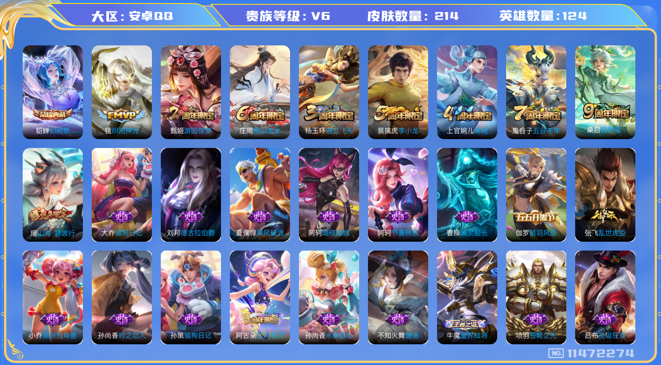 [11472274]V6 1典藏 2传说 124英雄 214皮肤 可修改实名 荣耀水晶:幻阙歌(貂蝉典藏) 传说皮:炽阳神光 珍宝阁皮:妄想食味,优雅恋人,蔷薇恋人,女武神 限定皮:鸣野蒿,山海·碧波行(瑶年限),遇见飞天,高山流水,五谷丰年,游园惊梦,梁祝,李小龙 史诗皮:星界战将,蒙犽顽岩魄,紫霞仙子,苍穹之光,永昼,江河有灵,蒙恬荣光圣徽,冰冠公主,偶像歌手,晚萤,魅语,电玩·爆裂旋风,暗夜猫娘,末日机甲-吕布,猫狗日记-孙策,猫狗日记-大乔,时之恋人-孙尚香,乱世虎臣,节奏热浪,女仆咖啡,摇滚巨星,水果甜心,绅士熊喵,天才门将,功夫厨神,德古拉伯爵,暗隐猎兽者,幽灵船长,鬼剑武藏,纤云弄巧,繁星吟游(呼啦呼啦),缤纷独角兽,乘风破浪,逐浪之夏,热力回旋,箭羽风息,金属风暴,原初追逐者,圣诞狂欢,圣诞恋歌,鹰眼统帅,魅力维加斯,黎明之约,千筹问战,未来纪元-赵云