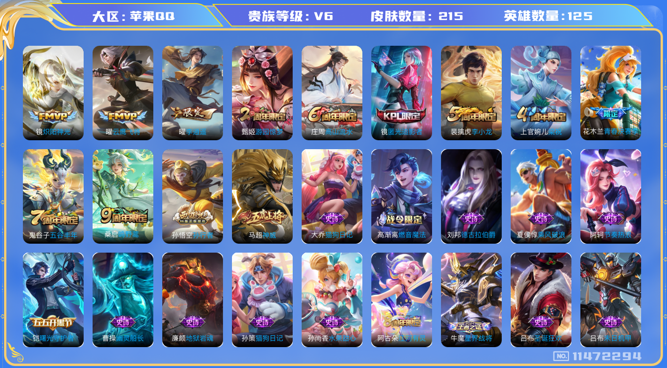 [11472294]V6 4传说 125英雄 215皮肤 可修改实名 传说皮:李逍遥,云鹰飞将(小将军),炽阳神光 珍宝阁皮:妄想食味,蔷薇恋人 限定皮:鸣野蒿,神威(电光马子),高山流水,五谷丰年,游园惊梦,梁祝,李小龙,孙行者,青春决赛季,匿光追影者 史诗皮:星界战将,特工魅影,千年之狐,永昼,江河有灵,高渐离燃音魔法,百解令(蒙犽),蒙恬荣光圣徽,偶像歌手,无限星赏官,末日机甲-吕布,猫狗日记-孙策,猫狗日记-大乔,节奏热浪,修罗,女仆咖啡,水果甜心,天才门将,星夜王子,功夫厨神,德古拉伯爵,暗隐猎兽者,幽灵船长,鬼剑武藏,地狱岩魂,纤云弄巧,拒霜思,乘风破浪,逐浪之夏,水晶猎龙者,曙光守护者,金属风暴,原初追逐者,圣诞狂欢,圣诞恋歌,鹰眼统帅,暗夜贵公子,魅力维加斯,黎明之约,赏金猎手,无心,未来纪元-赵云