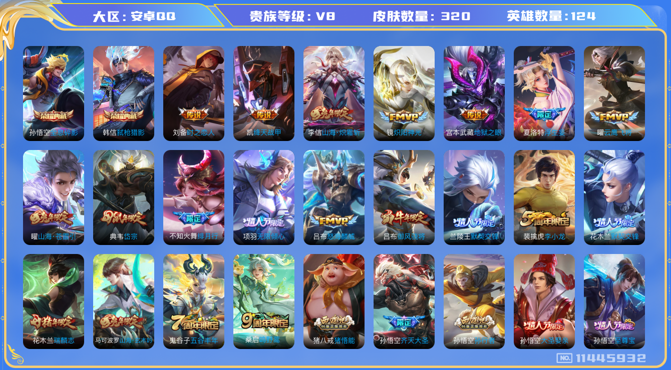 [11445932]V8 2典藏 15传说 124英雄 320皮肤 可修改实名 优质装备:全息碎影(猴子典藏),弑枪猎影(韩信典藏),云鹰飞将(小将军),绛天战甲(鸡嘴战神),炽阳神光,地狱之眼,时之恋人-刘备(电焊工),山海·炽霜斩(李信年限),山海·苍雷引(电光曜子),浮生妄 珍宝阁皮:优雅恋人,蔷薇恋人,玩趣恶龙 限定皮:鸣野蒿,至尊宝,绯月行,飞衡(韩信年限),无限倾心-项羽,瑞麟志(木兰年限),齐天大圣,怒海麟威,五谷丰年,御风骁将(吕布年限),岱宗(典韦年限),李小龙,默契交锋-兰陵王,默契交锋-花木兰,孙行者,猪悟能,大圣娶亲,引擎之心,美猴王,山海·玄木吟(马可年限) 史诗皮:鸭鸭历险记-刘禅,星界战将,龙之律动,雪豹·霜爪,石田雨龙,蒙犽顽岩魄,蔬乡物语(鲁班七号),紫霞仙子,黄金分割率,特工魅影,千年之狐,永昼,匿光破解者,百相守梦(刘备),百相守梦(关羽),电玩·爆裂旋风,江河有灵,百解令(蒙犽),高渐离燃音魔法,蒙恬荣光圣徽,偶像歌手,龙骑士(小龙虾),暗夜猫娘,晚萤,冰冠公主,末日机甲-吕布,猫狗日记-孙策,乱世虎臣,节奏热浪,修罗,女仆咖啡,摇滚巨星,水果甜心,绅士熊喵,天才门将,星夜王子,心灵骇客,功夫厨神,德古拉伯爵,暗隐猎兽者,幽灵船长,鬼剑武藏,心灵战警,舞动绿茵,地狱岩魂,诗语江南,纤云弄巧,拒霜思,缤纷独角兽,乘风破浪,逐浪之夏,月团寄思,水晶猎龙者,曙光守护者,热力回旋,箭羽风息,金属风暴,原初追逐者,圣诞狂欢,圣诞恋歌,鹰眼统帅,魅力维加斯,黎明之约,赏金猎手,千筹问战,无心,未来纪元-赵云,玫瑰异探