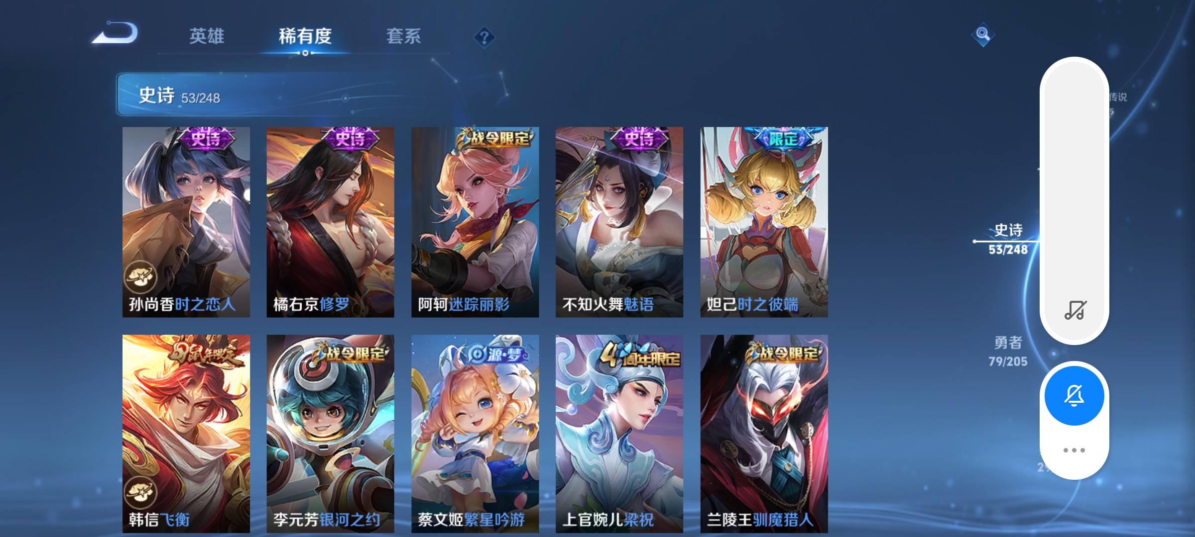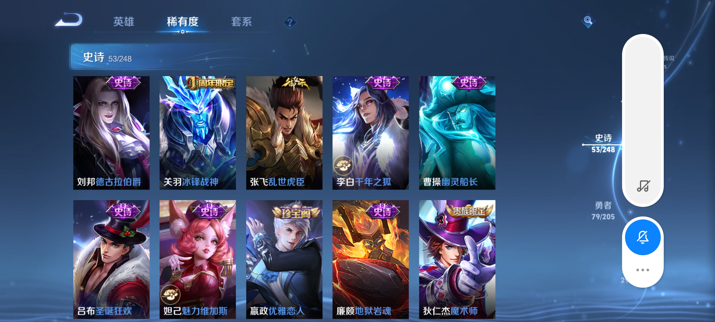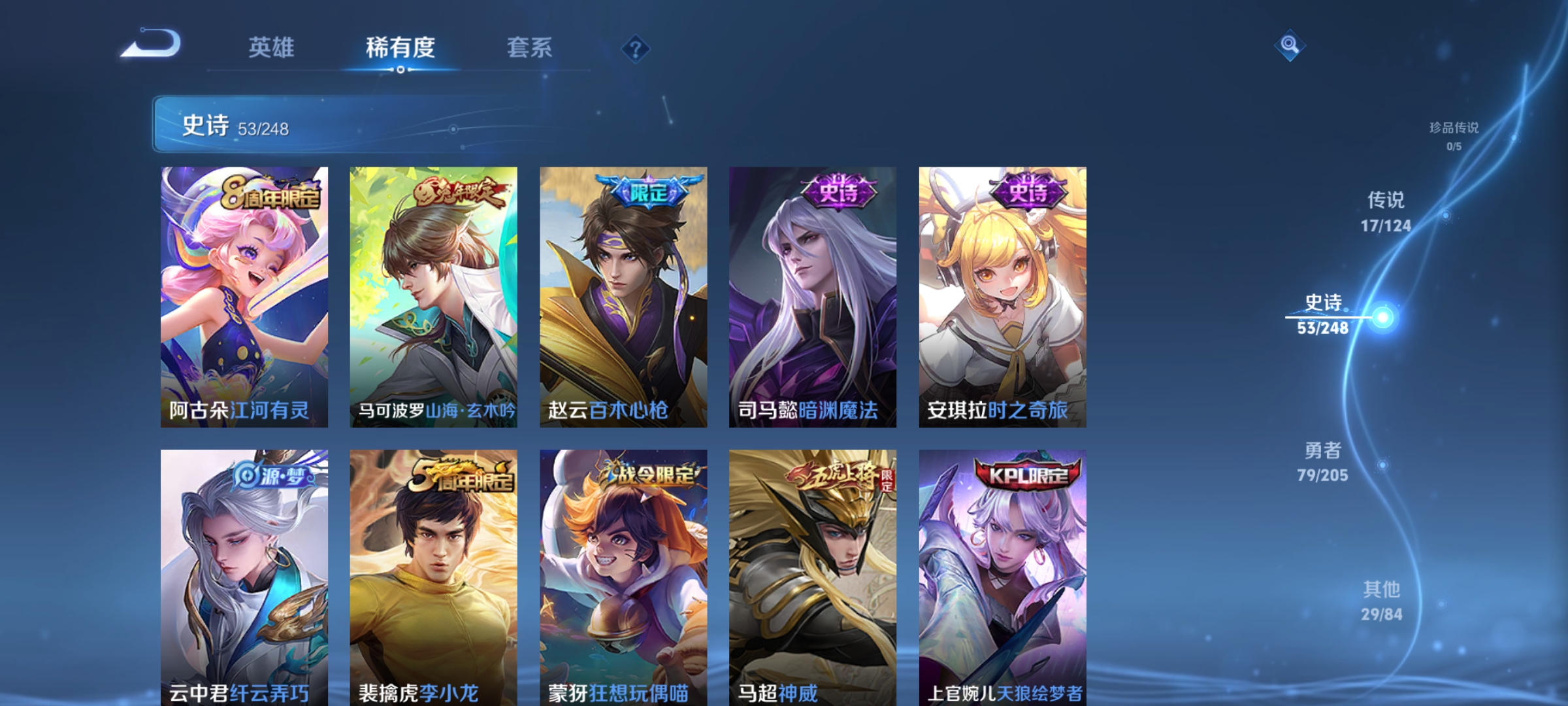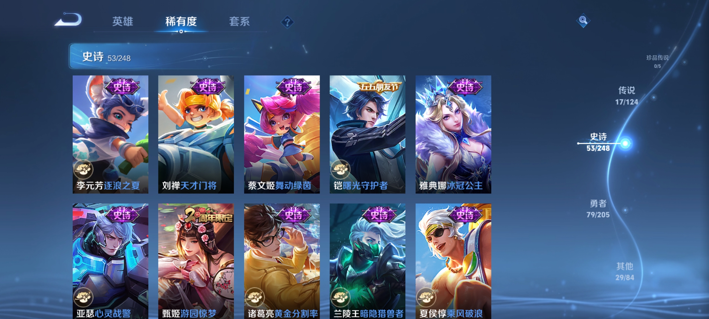 虞姬凯尔特女王,白起狰,太乙真人饕餮,曹操烛龙,芈月重明,典韦穷奇,狂铁御狮,米莱狄御霄,牛魔御旌,盾山御銮,夏侯惇朔风刀,明世隐疑决卦,老夫子醍醐杖,鬼谷子原初探秘者,狄仁杰万华元夜,程咬金演武夺筹,钟馗驱傩正仪,苏烈千军破阵,吕布猎兽之王,嬴政白昼王子,女娲朔望之晖,典韦蓝屏警告,钟馗神迹守卫,鲁班七号狮舞东方,沈梦溪星空之诺,李元芳银河之约,刘邦夺宝奇兵,蒙犽狂想玩偶喵,弈星混沌棋,李元芳云中旅人,桑启海盐诗旅,裴擒虎擒涛扼浪