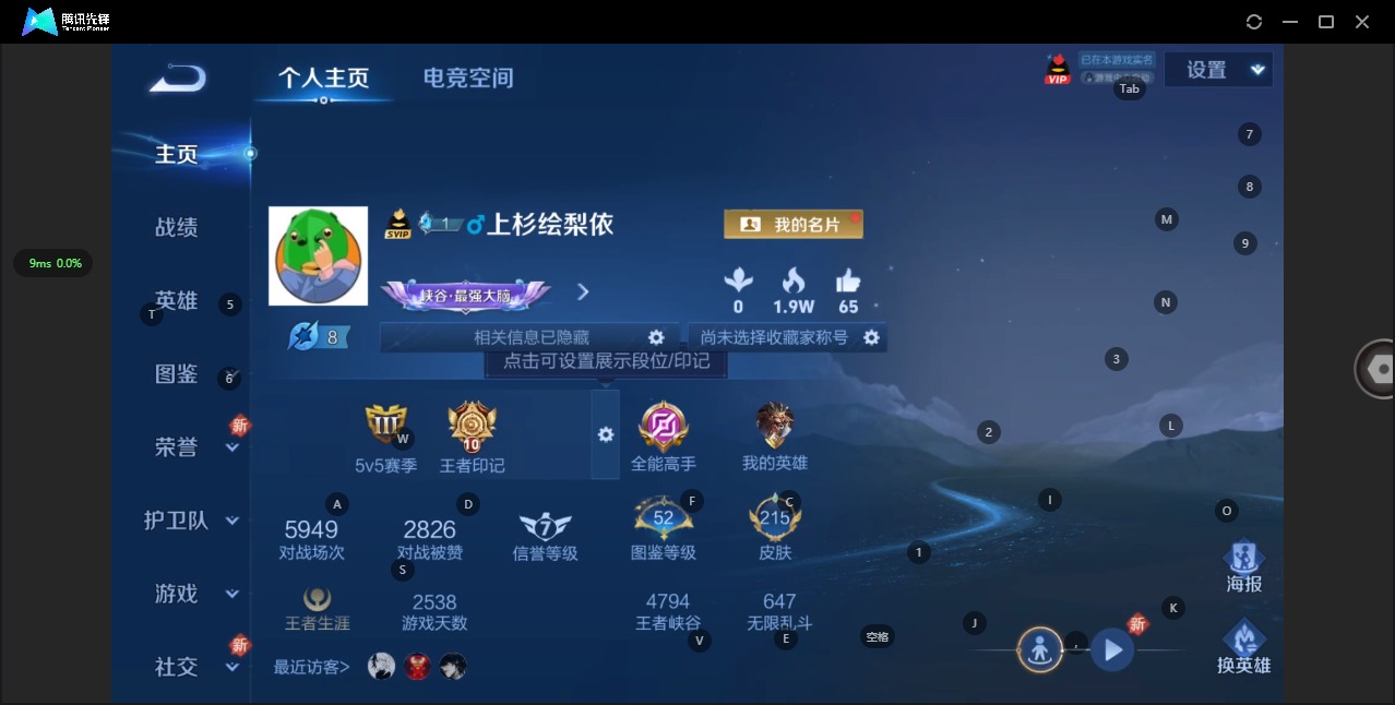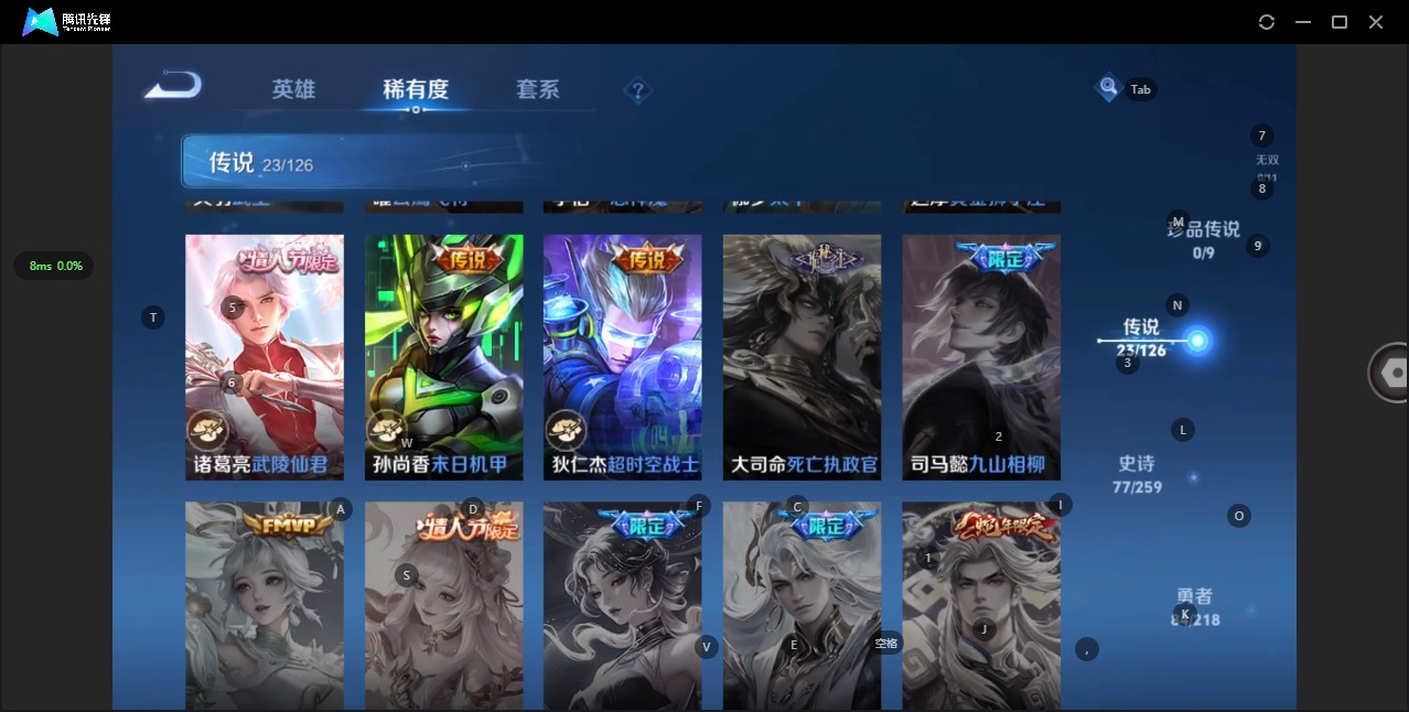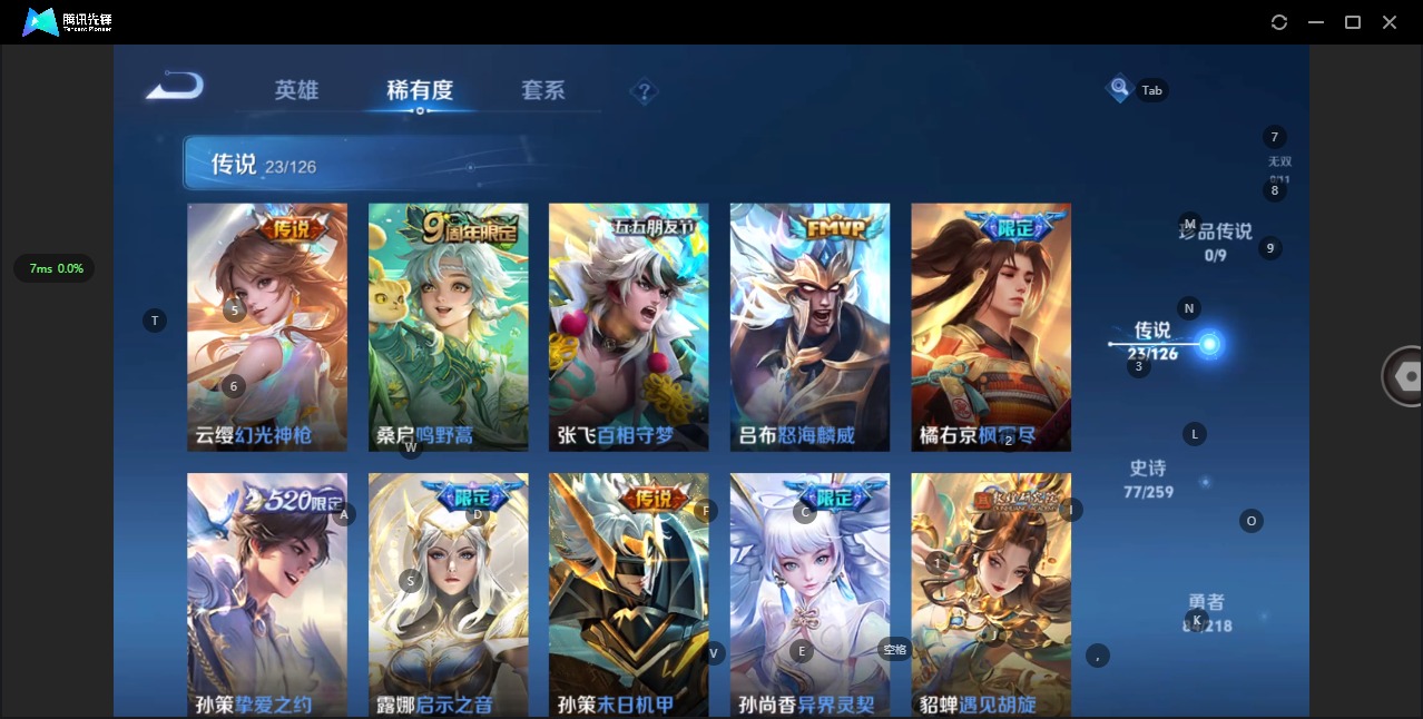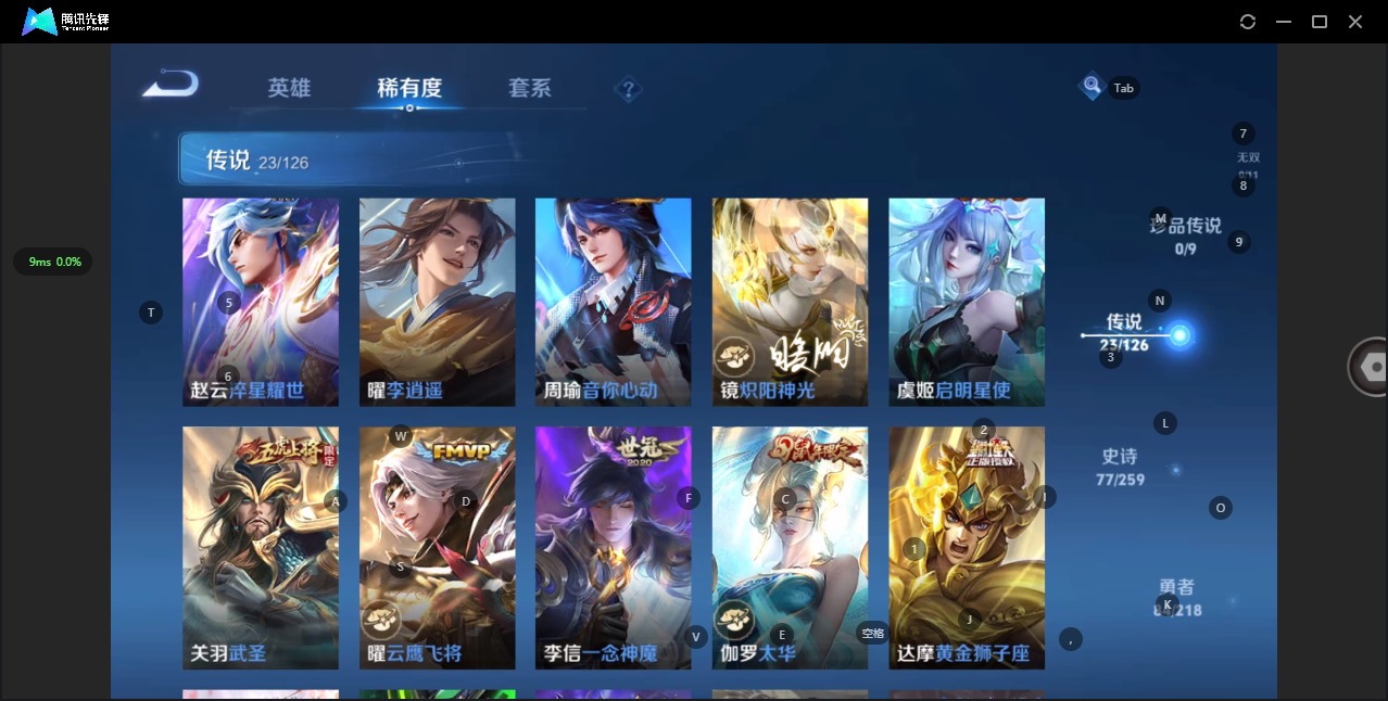 - [12027826]V9 2典藏 1无双 33传说 125英雄 397皮肤 可修改实名 女号 荣耀水晶:鸣剑·曳影,弑枪猎影(韩信典藏) 无双皮:碎月剑心(李白无双) 传说皮:牧神诗旅,黄金狮子座,黄金射手座,黄金白羊座,零号·赤焰,地狱之眼,末日机甲-孙尚香(绿蚂蚱),云霓雀翎,一念神魔,无双飞将,时之恋人-刘备(电焊工),绛天战甲(鸡嘴战神),超时空战士-狄仁杰,挚爱之约,音你闪耀(rap皮),神器·狴犴令,电玩·雷克斯,惊梅引,遇见神鼓,鲁班七号-时之奇旅 珍宝阁皮:优雅恋人,女武神,玩趣恶龙 限定皮:逐霄战戟,鸣野蒿,至尊宝,白虎志(电光耗子),凤求凰(白切鸡),梅西,武陵仙君(小桃花),异界灵契(白毛香),傲雪梅枪,魔法小厨娘,时雨天司(水龙头),神威(电光马子),飞衡(韩信年限),诗剑行,匿光决锋者,降魔,五谷丰年,青龙志(铠年限),冰锋战神,梁祝,御风骁将(吕布年限),天狼狩猎者,龙胆,烈魂,祈雪灵祝(雪兔子),天狼绘梦者,李小龙,逐梦之影,辉光之辰,如梦令-嫦娥,如梦令-后羿,霸王别姬-项羽,霸王别姬-虞姬,孙行者,大圣娶亲,引擎之心,天魔缭乱,冰霜恋舞曲,美猴王,无尽星芒,深海之息(深海大菠萝),枫霜尽,山海·玄木吟(马可年限) 史诗皮:星界战将,谪仙醉月,灵蛊蚀心,龙之律动,藏狐·褐绒,石田雨龙,百相守梦-百里守约,怒海争锋,炽弈燎原,破空之剑,紫霞仙子,苍穹之光,电玩小子(小书包),白龙吟,黄金分割率,特工魅影,千年之狐,永昼,末日机甲-莱西奥,匿光侦查者,江河有灵,百解令(蒙犽),蒙恬荣光圣徽,偶像歌手,白蛇,百相守梦(关羽),暗夜猫娘,龙骑士(小龙虾),末日机甲-吕布,猫狗日记-孙策,猫狗日记-大乔,乱世虎臣,节奏热浪,女仆咖啡,摇滚巨星,水果甜心,绅士熊喵,天才门将,星夜王子,心灵骇客,功夫厨神,德古拉伯爵,暗隐猎兽者,幽灵船长,鬼剑武藏,心灵战警,舞动绿茵,地狱岩魂,纤云弄巧,繁星吟游(呼啦呼啦),拒霜思,缤纷独角兽,乘风破浪,逐浪之夏,水晶猎龙者,曙光守护者,箭羽风息,金属风暴,原初追逐者,圣诞狂欢,圣诞恋歌,鹰眼统帅,暗夜贵公子,魅力维加斯,黎明之约,赏金猎手,无心,未来纪元-赵云
