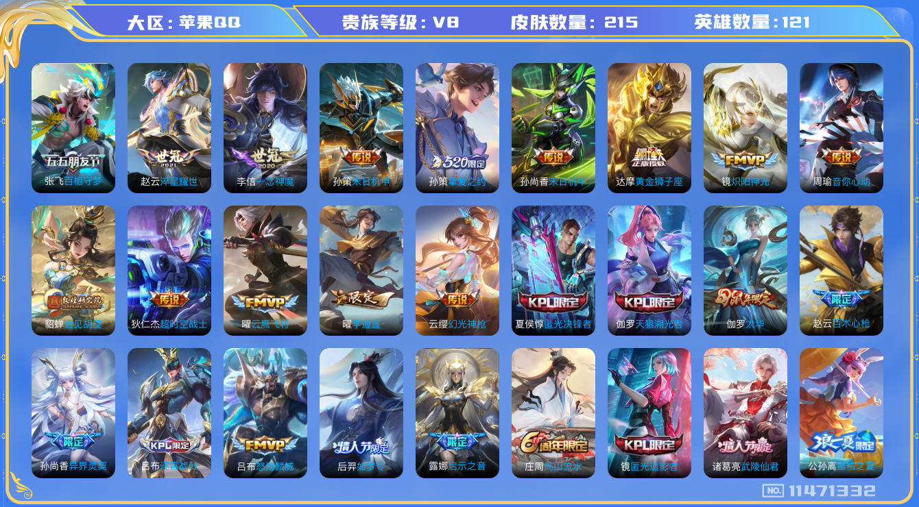 [11471332]V8 23传说 121英雄 215皮肤 可修改实名 优质装备:黄金狮子座,云鹰飞将(小将军),炽阳神光,一念神魔,末日机甲-孙尚香(绿蚂蚱),音你心动-周瑜,李逍遥,淬星耀世,超时空战士-狄仁杰,遇见胡旋,末日机甲-孙策,挚爱之约,百相守梦(张飞) 传说皮:幻光神枪 珍宝阁皮:妄想食味,蔷薇恋人 限定皮:逐霄战戟,鸣野蒿,太华(伽罗年限),武陵仙君(小桃花),异界灵契(白毛香),傲雪梅枪,白晶晶,神威(电光马子),高山流水,匿光决锋者,怒海麟威,五谷丰年,武圣,梁祝,天狼溯光者,李小龙,朱雀志(守约年限),如梦令-后羿,孙行者,青春决赛季,蜜橘之夏,匿光追影者,百木心枪,启示之音,枫霜尽,神器·万象笔 史诗皮:化蝶舞,破空之剑,百相守梦-百里守约,黄金分割率,特工魅影,永昼,偶像歌手,魅语,冰冠公主,青蛇,末日机甲-吕布,猫狗日记-孙策,修罗,女仆咖啡,摇滚巨星,水果甜心,绅士熊喵,星夜王子,心灵骇客,功夫厨神,德古拉伯爵,暗隐猎兽者,幽灵船长,鬼剑武藏,暗渊魔法,心灵战警,地狱岩魂,纤云弄巧,繁星吟游(呼啦呼啦),拒霜思,缤纷独角兽,乘风破浪,逐浪之夏,龙鼓争鸣,水晶猎龙者,曙光守护者,箭羽风息,金属风暴,原初追逐者,圣诞狂欢,鹰眼统帅,暗夜贵公子,魅力维加斯,黎明之约,天秀·音浪,无心