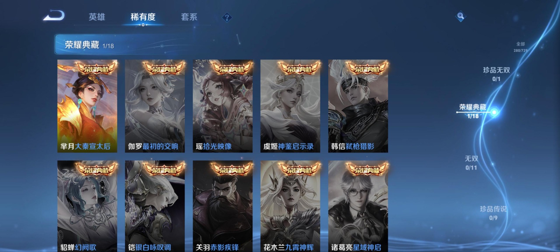 刘邦夺宝奇兵,夏侯惇朔风刀,老夫子醍醐杖,沈梦溪星空之诺,沈梦溪大漠名商,盾山御銮,曹操烛龙,典韦穷奇,牛魔御旌,项羽苍威无极,吕布猎兽之王,镜青焰无极,元歌云间偶戏,兰陵王金庭之子,裴擒虎擒涛扼浪,鲁班大师探海日志,明世隐疑决卦,蒙犽狂想玩偶喵,马可波罗暗影游猎,鬼谷子原初探秘者,张良古海寻踪,桑启海盐诗旅,狄仁杰万华元夜,嬴政白昼王子,芈月重明,程咬金演武夺筹,李元芳银河之约,李元芳云中旅人,弈星混沌棋,米莱狄御霄,钟馗驱傩正仪,狂铁御狮