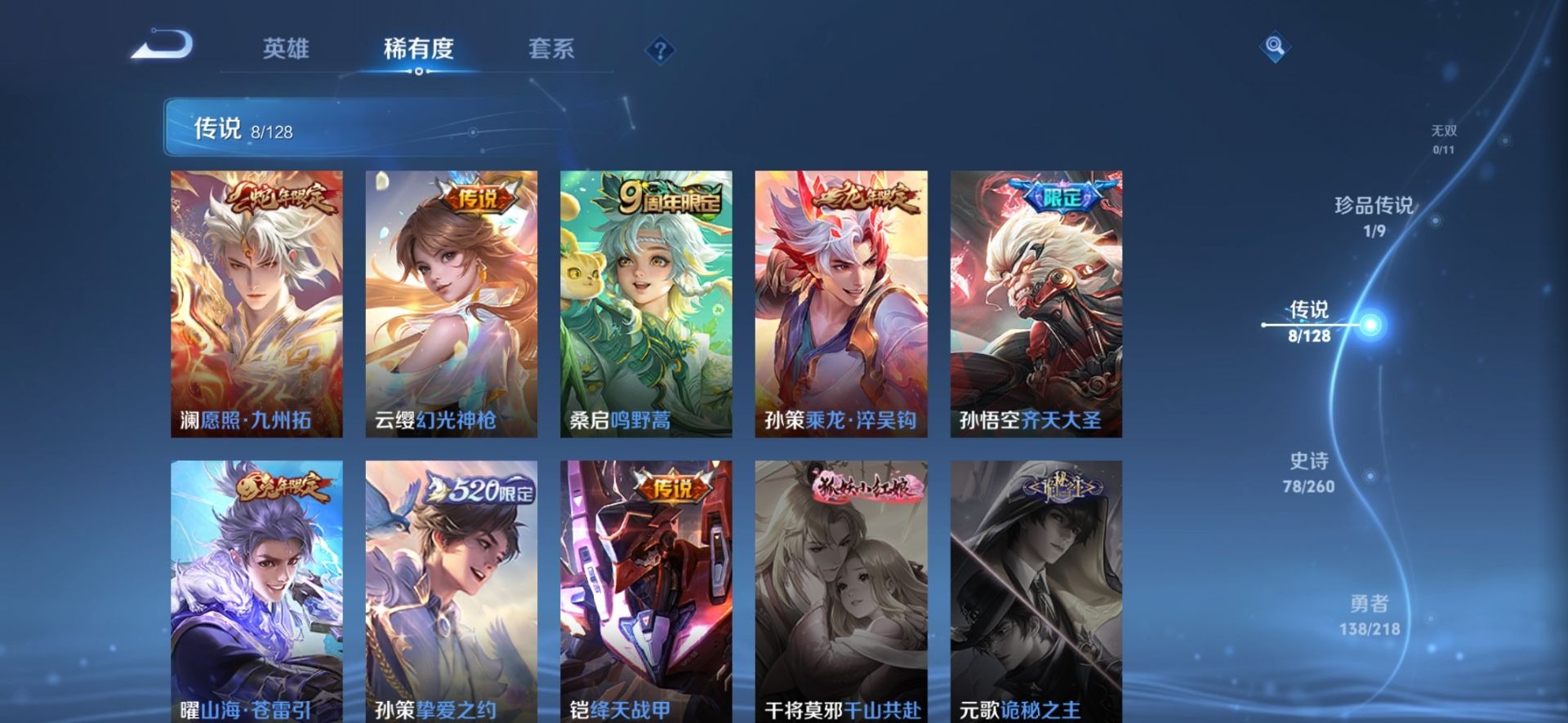 - [11471621]实名: 可修改 贵族等级: V8 英雄数: 125 皮肤数: 244 荣耀水晶: 银白咏叹调,神鉴启示录 珍品传说: 怪盗基德,器灵·落星盏 传说皮: 黄金狮子座,黄金射手座,久胜战神,末日机甲-孙尚香,胖达荣荣,乞巧织情,超时空战士-狄仁杰,无双飞将,记忆之芯,惊梅引,幻光神枪,祥瑞亨通 限定皮: 李小龙,游园惊梦,飞衡,大圣娶亲,高山流水,匿光追影者,傲雪梅枪,枫霜尽,五谷丰年,怒海麟威,山海·玄木吟,鸣野蒿,陌上桑,映山客,愿照·九州拓