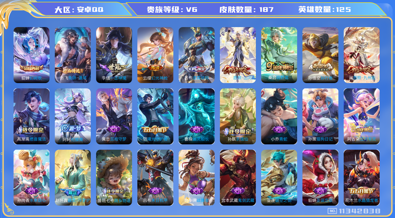 [11342838]V6 1典藏 1珍品传说 5传说 125英雄 187皮肤 可修改实名 优质装备:幻阙歌(貂蝉典藏),一念神魔 珍品传说:兔狲·蓬尾 传说皮:幻光神枪 珍宝阁皮:妄想食味 限定皮:愿照·九州拓(澜年限),愿照·山河定(司空震年限),逐霄战戟,鸣野蒿,孙行者 史诗皮:器灵·浮梦炉,化蝶舞,龙之律动,雪豹·霜爪,茶境仙,炽弈燎原,破空之剑,战舞者,蒙犽顽岩魄,决胜骁骑,蔬乡物语(鲁班七号),百相守梦-百里守约,百相守梦-黄忠,织梦人,特工魅影,千年之狐,江河有灵,百解令(蒙犽),高渐离燃音魔法,青蛇,末日机甲-吕布,猫狗日记-孙策,女仆咖啡,水果甜心,星夜王子,功夫厨神,幽灵船长,鬼剑武藏,心灵战警,舞动绿茵,纤云弄巧,拒霜思,逐浪之夏,水晶猎龙者,曙光守护者,圣诞恋歌,鹰眼统帅,魅力维加斯,未来纪元-赵云
