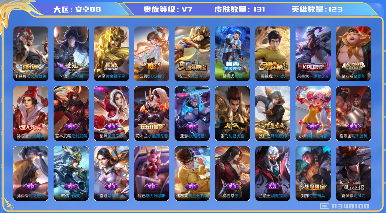 - [11864080]V7 1典藏 1无双 5传说 125英雄 251皮肤 可修改实名 优质装备:幻阙歌(貂蝉典藏),韩信群星魔术团(韩信无双),黄金射手座,无双飞将 珍宝阁皮:妄想食味,优雅恋人,蔷薇恋人 限定皮:鸣野蒿,至尊宝,神威(电光马子),飞衡(韩信年限),高山流水,诗剑行,齐天大圣,五谷丰年,青龙志(铠年限),梁祝,李小龙,逐梦之影 史诗皮:灵蛊蚀心,星界战将,埋骨钱,百相守梦-百里守约,百相守梦-黄忠,电玩小子(小书包),白龙吟,特工魅影,江河有灵,百解令(蒙犽),高渐离燃音魔法,蒙恬荣光圣徽,电玩·爆裂旋风,猫狗日记-孙策,乱世虎臣,摇滚巨星,水果甜心,绅士熊喵,天才门将,暗隐猎兽者,鬼剑武藏,舞动绿茵,地狱岩魂,繁星吟游(呼啦呼啦),拒霜思,缤纷独角兽,乘风破浪,逐浪之夏,箭羽风息,金属风暴,圣诞狂欢,圣诞恋歌,鹰眼统帅,魅力维加斯,黎明之约,无心,未来纪元-赵云