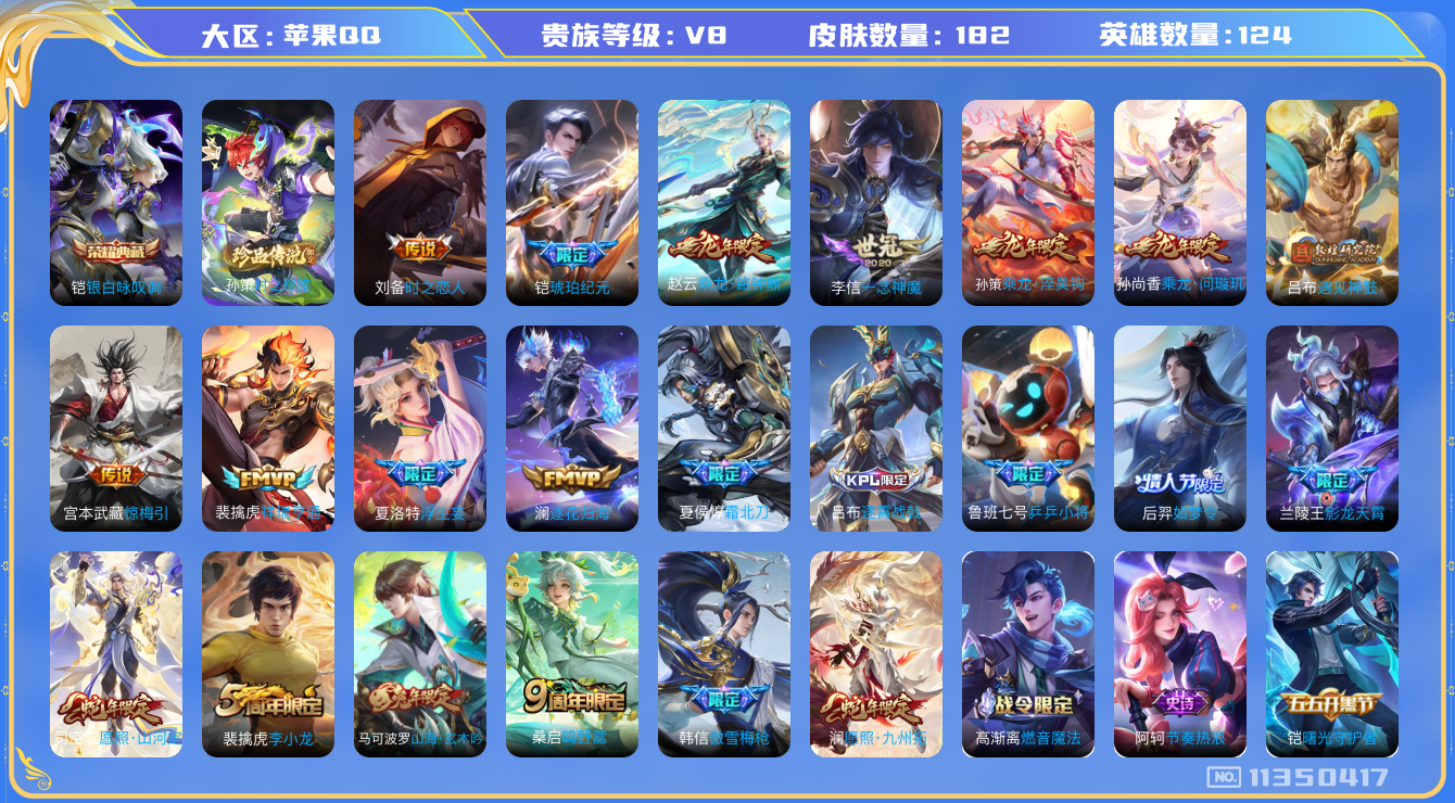 [11350417]V8 1典藏 1珍品传说 17传说 124英雄 182皮肤 可修改实名 优质装备:银白咏叹调(倪克斯侍卫),一念神魔,时之恋人-刘备(电焊工),浮生妄,惊梅引,遇见神鼓,澜逐花归海,琥珀纪元铠 珍品传说:时之奇旅-孙策 传说皮:乘龙·问璇玑(孙尚香年限),乘龙·铭钟鼎(赵云年限),乘龙·淬吴钩(孙策年限),祥瑞亨通 珍宝阁皮:蔷薇恋人 限定皮:愿照·九州拓(澜年限),愿照·山河定(司空震年限),逐霄战戟,鸣野蒿,夏侯惇霜北刀,傲雪梅枪,影龙天霄,李小龙,如梦令-后羿,乒乒小将,山海·玄木吟(马可年限) 史诗皮:鸭鸭历险记-刘禅,谪仙醉月,茶境仙,破空之剑,涂山红红,东方月初,蒙犽顽岩魄,琥珀纪元伽罗,百相守梦-百里守约,星界特工,遇见神鹿,紫霞仙子,特工魅影,江河有灵,百解令(蒙犽),高渐离燃音魔法,冰冠公主,乱世虎臣,节奏热浪,摇滚巨星,水果甜心,星夜王子,功夫厨神,暗隐猎兽者,幽灵船长,鬼剑武藏,舞动绿茵,地狱岩魂,纤云弄巧,曙光守护者,箭羽风息,金属风暴,鹰眼统帅,魅力维加斯,赏金猎手,未来纪元-赵云