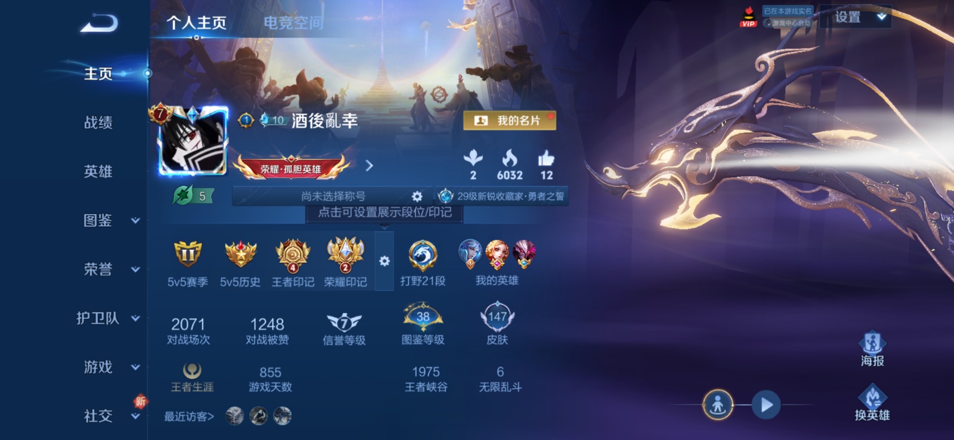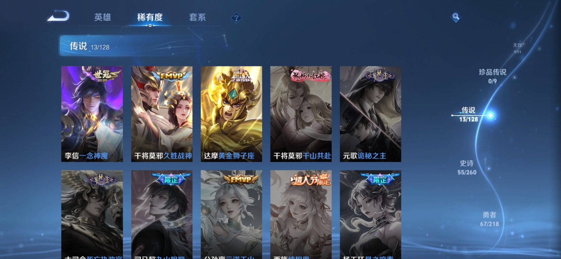 - PX_2073082-贵族等级: V4 英雄数: 123 皮肤数: 124 限定皮: 遇见飞天,李小龙,高山流水,五谷丰年,诗剑行,鸣野蒿