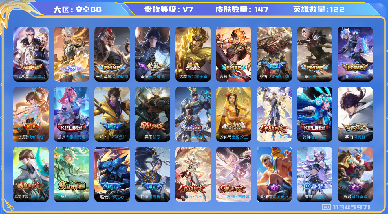 [11345971]V7 1典藏 1无双 13传说 122英雄 147皮肤 可修改实名 优质装备:星域神启(倪克斯贼亮),器灵·螭龙剑,黄金狮子座,云鹰飞将(小将军),久胜战神,一念神魔,零号·赤焰,澜逐花归海 传说皮:祥瑞亨通,幻光神枪 珍宝阁皮:玩趣恶龙 限定皮:愿照·九州拓(澜年限),愿照·岁时盈(虞姬年限),愿照·山河定(司空震年限),逐霄战戟,鸣野蒿,傲雪梅枪,诗剑行,岱宗(典韦年限),天狼溯光者,逐梦之音,引擎之心,百木心枪,玉兔公主,山海·玄木吟(马可年限) 史诗皮:鸭鸭历险记-刘禅,器灵·浮梦炉,糖绘人间,化蝶舞,谪仙醉月,龙之律动,石田雨龙,茶境仙,怒海争锋,破空之剑,决胜骁骑,百相守梦-百里守约,紫霞仙子,电玩小子(小书包),黄金分割率,特工魅影,千年之狐,江河有灵,百解令(蒙犽),偶像歌手,女仆咖啡,水果甜心,天才门将,星夜王子,功夫厨神,暗隐猎兽者,幽灵船长,鬼剑武藏,心灵战警,天秀·启明,地狱岩魂,纤云弄巧,拒霜思,乘风破浪,逐浪之夏,水晶猎龙者,曙光守护者,箭羽风息,金属风暴,圣诞狂欢,鹰眼统帅,魅力维加斯,黎明之约,未来纪元-赵云